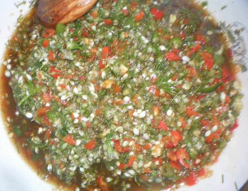 今天的早市上看到有卖韭菜花的,想起小时候家里种过,也吃过!就顺便买了半斤,才一元钱,因为花儿很轻,半斤就买了一大袋呢! ![]() 韭花又名韭菜花,是秋天里韭白上生出的白色花簇,多在欲开未开时采摘,磨碎后腌制成酱食用,农家多称之为“韭菜花”。韭菜花是中国南北城乡普遍食用的一种佐料。 韭菜花营养分析: 韭菜花富含水分,蛋白质,脂肪,糖类,灰分,矿物质钙、磷、铁,维生素A原、维生素B1、维生素B2、维生素c和食物纤维等。适宜夜盲症,干眼病之人食用,因为韭菜花中所含大量的维生索A原可维持视紫质的正常效能。又适宜皮肤粗糙以及便秘之人食用。 适宜夜盲症、皮肤粗糙、便秘、干眼病患者多食。 回来以后我没有按照以往的做法,把它做韭花酱!直接清洗干净,切碎了和青红辣椒一起,凉拌!用熟油一泼,调上盐,鸡精,花椒粉,生抽,岐山醋!呵呵,味道美极了! ![]() 这道菜! 有韭菜的清香,青红辣椒的辛辣!呵呵,很棒哦!可惜阳阳只吃了一口就辣的哇哇大叫!这盘韭菜花让阳爸爸多吃了俩馒头,特下饭! 本作品未经作者许可不得转载,转载请征求作者意见。擅自转载使用,将保留追究其法律责任的权利!