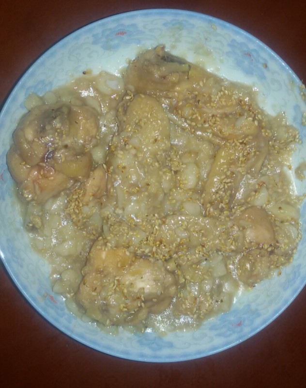 大家知道这是什么菜吗?因为俺做失败了,所以它的卖相才会这么的差,让人看不清楚它竟然是什么?其实它是由鸡腿、山药泥和白芝麻做成的。做这道菜时,我如果多点耐心,或许它就不会被我做成这样了。我在做这菜时,不应该那么早就放山药泥的,应该在鸡腿差不多熟的时候再放,这样的话山药泥就不会那么容易糊锅,也不会把鸡腿诱人的颜色都挡住了。 幸好家里还有炒制过的香喷喷的白芝麻,否则这道菜的样子会更难看,而小不点也不会对它产生吃的欲望。虽然它的卖相比较差,但小不点还是很喜欢吃这菜里面的山药泥和白芝麻,可里面的鸡腿肉他就不怎么喜欢吃了。