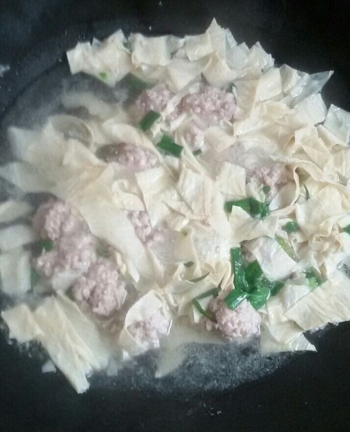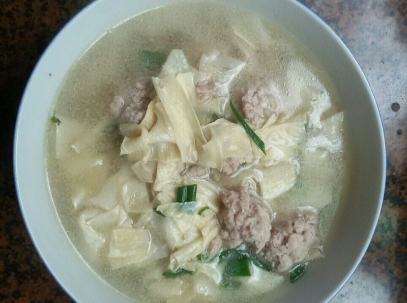 这是我做的腐竹瘦肉丸汤。虽然它的样子看起来有点清淡,但味道还是蛮不错的,而且深受小家伙的喜爱。其实,我以前做这汤时一般是用瘦肉片或鱼头来煮的。可考虑到现在的小不点不吃剔牙的瘦肉,我也不敢给他吃鱼头,所以我就把猪瘦肉都剁成肉末,然后用生粉、食盐、酱油和花生油搅匀,然后在煮腐竹汤的时候用手随便把肉末捏成一个个的小肉丸(备用),直到锅里的腐竹煮好了煮软了再把捏好的瘦肉丸放到锅里煮,稍煮几分钟后即可撒入葱花调味出锅食用。不过,在做这道菜之前,最好选用那些质量好口感好一些的腐竹,然后再用清水浸泡一两个小时后再把腐竹切成小段,然后下锅煮,这样的腐竹不但吃起来又爽又滑,而且整洁美观令人有食欲,更重要的是这腐竹瘦肉汤非常的鲜甜和好喝。