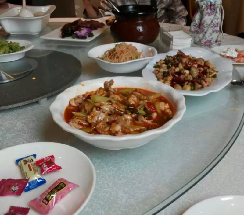 ![]() ![]() ![]() 昨天是朋友家的婆婆满60的大寿,虽说没有专门的大办,但也是专门请的她家的亲戚来的,都有4大桌的人了,再加上我们这几个同学加好朋友,又是一大桌子呢,也就5桌了,还是专门在某个地方的王府菜去包了个大包房,正确说是两个大包房,因为中间有个屏风是可以拆开的,需要时就把那屏风取下来,两个房间自然就连通在一起了。 老公早上临时还出去办点事,也就比我们早走,我和罐罐是11点过了才出去的,反正去早了也没什么事情的,到那里正好是12点,正是开饭时间呢。昨天的温度是28度,早上一起就有很大的太阳,还好给罐罐穿的短袖子呢,就坐车去的一会就热得很。 ![]() 这是罐罐第一个看上的菜品,他说是烤鸭,其实是烟熏酱鸭,就象卤鸭子那种,吃起来很香的 ![]() 蟹黄玉米,这道菜好像是酒席上最常见的,里面还有个稍微小点的碗,里面也是装的螃蟹,只是只有螃蟹腿,好像是醋泡着的,我是没吃,好像不是很受欢迎,最后还是几个男人们在聊天时拿来啃着耍才解决的 ![]() 这个是清蒸的什么鱼,我倒没怎么吃,不知道味道怎样 ![]() 泡椒田蛙,感觉没外面的大排档好吃,旁边的是尖椒鸡,味道也一般,记得原来有次在这里吃过的,好像没原来的好吃了,难道是换了厨师了吗?具体是什么原因就不知道了 ![]() 大概拍了一张整体图,有蒜薹炒腊肉,粉条炖的猪膀,红烧蹄筋,这个味道还不错,我喜欢这个,还有什么黄金糕和寿包,西瓜什么的,另外还有两个汤,还有些菜我忘记了,整体感觉一般吧,这是中午的,晚上我们也是在那里吃的,感觉晚上的家常菜更好吃点,更对大家的胃口,看来点菜很重要呀。 ![]() 罐罐同学第一眼看上的就是烟熏鸭子,一看到大家都在吃了,马上就叫我给他夹一块,自己就啃起来了 ![]() 看看罐罐是啃得多专心呀,旁边的小朋友却是无比的挑剔,说是这样不吃那样也不吃的,罐罐才不理睬他呢,自己吃自己的,这点还是很好,至少不用担心他饿肚子的。