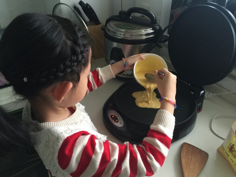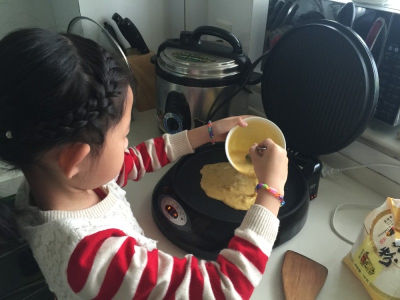 因为婠婠不敢点煤气灶,所以用的是电饼铛。电饼铛加热上,刷上一层油,把面糊倒入摊平,盖上盖子二分钟。