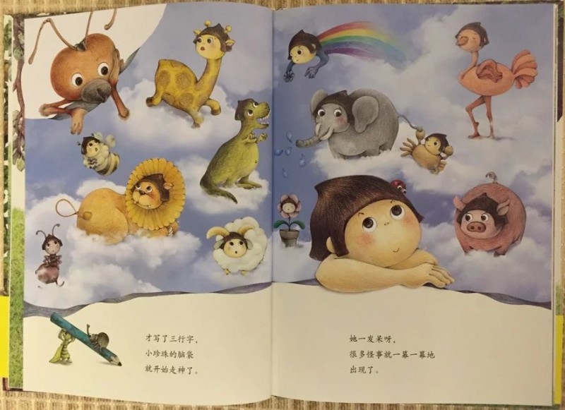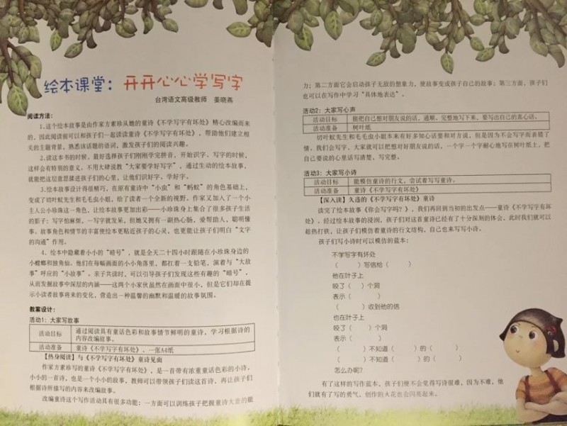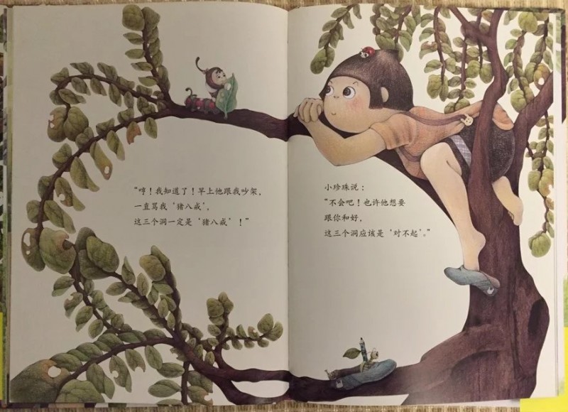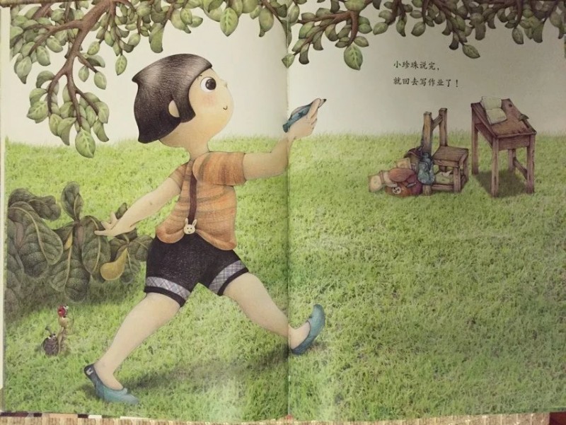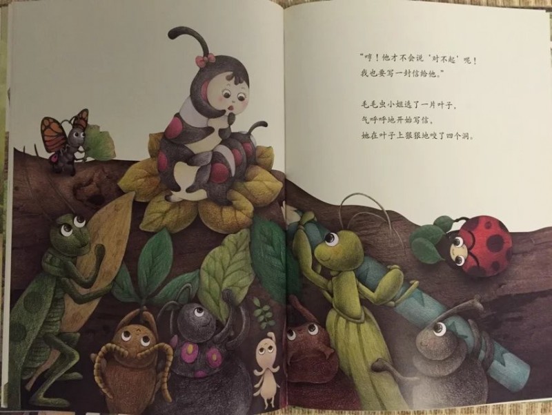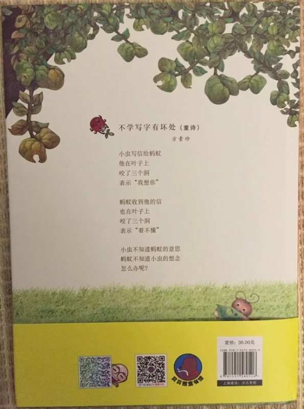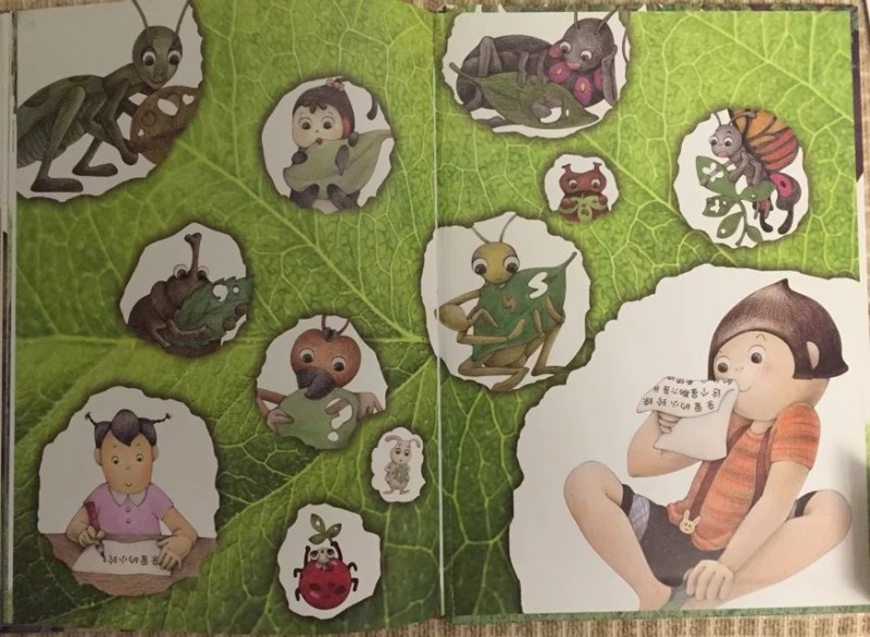 ![]() 精装大开本图书,其插画质量和文字排版都是非常棒的!果不其然,这本书精美细致的插画和插画中种种有趣的细节更是让人唏嘘不已。搭配诗一般的文字和童话意境,真是一点儿都不输国外的大奖绘本呢! ![]() ![]() ![]() 拿到书本来打算自己先翻看一下再亲子共读的,谁知道刚翻了几页,本来在一旁玩的小家伙就被书中精彩的图画深深吸引了过来,居然要过书自己翻看了起来。翻看一遍后又聚精会神地跟我一起共读了一遍,还要求我给录音呢!这段时间我们主打绘本,看的几乎都是名家经典书系。这本书能如此吸引‘见过世面’的孩子,足以说明它的魅力和吸引力!一本书无论是不是大奖书系,能吸引孩子去深入其中,才是第一要素! ![]() ![]() 《你会写字吗?》之所以看到这个书名就很是期待。是因为对这个话题比较关注。我家宝贝正处于初学写字的阶段,而他又对写字这件事非常排斥。而我也因为担心孩子太小,掌握不了力度,写字太用力影响手肌的发育。所以,对于写字这个事情我也一直持纠结的态度,大部分时间也只能是任由他去了。这本书能不能帮到我,让小家伙对写字这件事情态度有所转变呢? 怀着这样的期许,和小家伙共读完了这本绘本。书中描述的是一个有趣的童话故事。故事精心改编自方素珍老师多年前写的一首诗《不会写字有坏处》。 ![]() 故事讲述的是一只切叶蚁先生和一条毛毛虫小姐之间因为没有语言文字为媒介,仅仅靠在树叶上’咬洞洞‘的方式传递信息,却因为互相猜错了意思,发生了一连串不愉快的事情。 不爱写字的小珍珠在故事中扮演了邮递员的角色。咬了三个洞的叶子是什么意思呢?小珍珠绞尽脑汁也想不明白,收信的毛毛虫小姐也看不明白,只能瞎猜。收到咬了四个洞的树叶回信后的切叶蚁同样靠猜测揣摩其中的意思。因为会错意,一个以为对方是在骂自己是猪八戒,一个以为自己已经说了对不起,对方却回复说自己是大坏蛋。结果两个小伙伴之间的误会越来越深,矛盾到了无法化解的地步。 唉,都是不懂文字惹得祸啊!看得读书的我们都着急了。如果两条虫虫都会写字的话,用文字明确地把自己的意思表达出来,就不用费劲儿去猜测对方的意思,也就不会有这么多的误会和不愉快了! 正是见证了虫虫世界不懂写字表达自己思想的悲哀,小珍珠才有了顿悟,从逃避和抱怨写字到主动去写字了。前后对比真是巨大啊!然而这样的情节却合情合理,丝毫没有夸张的感觉。孩子就是这样,当他们思想‘开窍’的时候,当他们主动认识到的时候,那种变化和进步是‘说教’所远远不能及的。 故事开头抱怨写字和神游的小珍珠几乎是所有初学写字的孩子们的化身,精彩而富于想象的神游画面刻画了孩子们普遍活泼、爱玩、喜欢自由的个性! 我家宝贝现在上幼儿园大班了,每天都有写字任务。可是每天让他写作业的时候,他不是推三阻四就是不断抱怨,不是说笔不好就是说字不好写。写一行字有时候都要磨磨唧唧半个小时才能搞定。有时候看他安安静静坐那儿写字呢,走到近前一看居然是在作业封皮上画画呢!真是和小珍珠如出一辙! ![]() 对于孩子来说,写字就是为了完成作业,不挨老师的批评。写字实在是一件非常枯燥的事情!反复重复着一件事情,对于不断追求新鲜感的孩子们来说,实在是太无聊了!回想起我刚上一年级,每天面对写字任务的时候,同样是这样的抱怨心情甚至是恐惧心理。只因为我们都不懂为什么要学写字,写字的意义是什么。 只有让孩子真正明白了写字的意义和乐趣,孩子才会真正改变态度。而这本书正是这么一个沟通的桥梁。写字的过程自然也是认字的过程,小珍珠可以看懂朋友写给她的信,同样也能通过写字给朋友回信。反过来说不写字不识字,既看不懂别人写的书信也无法通过书信传达自己的意思,就像书中的虫虫们。 ![]() 书中的图画看似不经意间描绘了很多可爱的小动物们。比如一直趴在小珍珠头发上充当发夹的七星瓢虫,比如出现在每一页最不显眼位置的独角仙和小螳螂。 当小珍珠在抱怨和神游时,七星瓢虫、独角仙和小螳螂却在聚精会神地研究小珍珠倒立着的语文课本。从扉页起就出现的独角仙和小螳螂一直扛着小珍珠丢弃的铅笔随着故事的发展适时地出现。它们似乎都在一直提醒和暗示着小珍珠:该去写字了!好好学语文吧,千万不要像这些没文化总是靠猜测会意却总会错意的虫虫们! 扉页上扛着大大的铅笔在树叶上写字的小螳螂和大大的“你会写字吗?”这几个字形成鲜明的对比,连小小的螳螂都在学写字,那么正在读书的你呢?不觉得写字是件很快乐很有意义的事情吗? ![]() 书的最后那支铅笔又回到了小珍珠手上,小瓢虫也从她的头上跳了下来,三只小虫子的使命完成。小小的虫子正是因为知道没文化的可悲才意识到学文化的重要意义。它们都懂得这个道理,聪明的小珍珠怎会不明白呢?而读书的孩子们则更是书外的'小珍珠们',自然也深刻理解了读书写字的重要性,明白了为什么要写字。他们不是为老师而学,而是为了更好地用文字和别人沟通而学! ![]() 这本书本身并没有‘说教’的痕迹,然而通过阅读有趣的童话故事却让读书的孩子们无形中受到了‘教化’,对写字这件事的态度发生了巨大的转变。书中方素珍老师分享的教孩子认字的方法和高级教师精心设计的‘绘本课堂’部分,也为我们这些因为