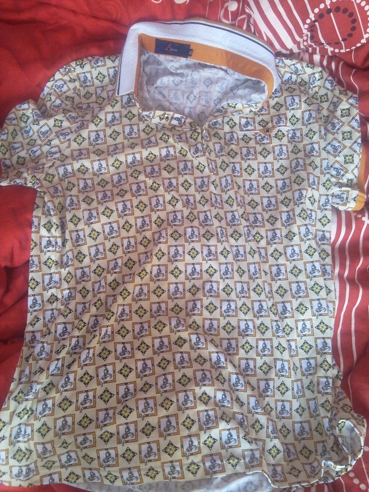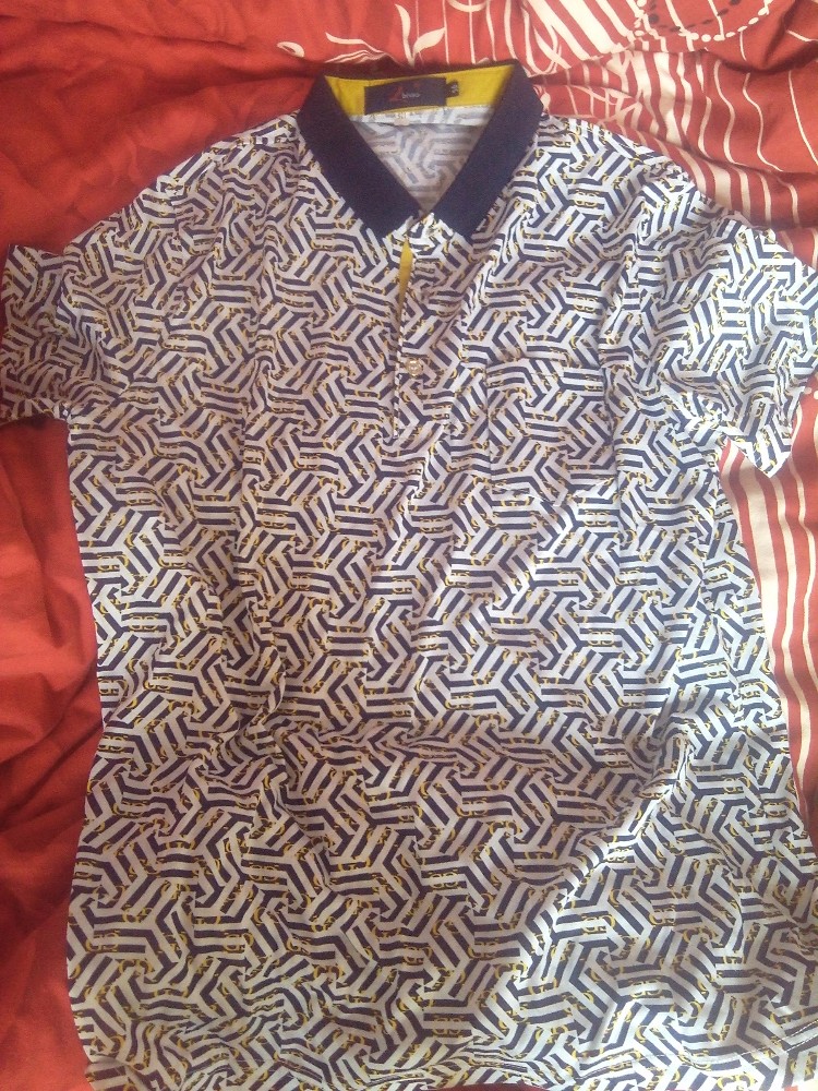 我左看看,右看看,果断的让卖家再拿大一码的给老公试试,这下子看着舒服多了,一直觉得看着不舒服,原来是衣服小了的原因,嘿嘿,试穿的这件是白色、藏青色和黄色相间的,虽然还是有藏青色,但一看上去还是觉得白色为主的,这个应该是视觉的效果吧,反正只要老公穿着好就行,面料我不知道是什么,我不太懂这个,反正老公说穿着舒服,这就够了。 有的短袖的颜色看着是很时尚的,但我总是觉得像我爸他们那个年龄穿的,然后被卖家鄙视了,呵呵,后来又试穿了一件淡黄色为主的短袖,上面的图案是正方形的,里面还有一匹马哦,看着还觉得挺有意思的哦,衣服摸上去很柔软,老公很喜欢。