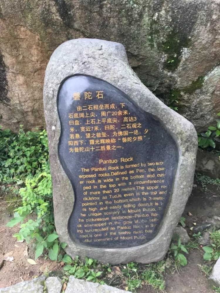 出了“观音古洞”往上走,岩崖上有两石酷似海龟,一龟蹲踞崖顶,回首顾盼,似有等候之意。 两龟的形态极为传神,令游人叹为观止。相传两龟是受龙王之命前来探听观音菩萨说法,只因听得入了迷,忘了归期,因而化龟为石。 ![]() ![]() ![]() 磐陀石 继续前行,来到了著名景点“磐陀石”脚下。“磐陀石”由上下两快巨石相叠而成,上石上广下锐,高达3米,宽近7米,顶巅平坦,可容三十人左右,拾级而上,以观沧海,视野宽阔。下石周广大20余米,将上石托住。两石间隙如线,睨之通明,似无着处。相传有人曾牵线横割而过,以后试者皆无成功。“磐陀石”险如滚卵,却安稳如磐,亿载未动,万劫不摇,为普陀胜境之绝。石上题有"磐陀石"、"金刚宝石"、"天下第一石"、"通灵"等字。"磐陀石"三字系明代抗倭名将侯继高所书。(注:此处引自百度百科)
