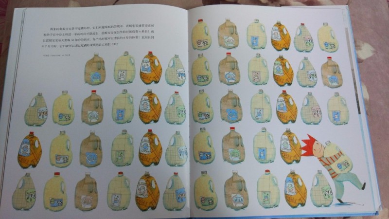 蓝鲸宝宝出生时就有6米,和我们的客厅差不多大,这个又惊到了宝贝,小家伙比划着我们人类的小婴儿出生时的大小,蓝鲸宝宝每天要喝50加仑的奶水,看着满书的牛奶,小家伙分页有序地数了起来,这无形中又锻炼了宝贝的数数能力,之前宝贝对整十的过渡还是有些生疏的!