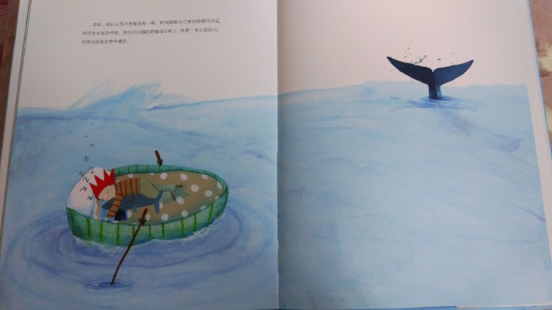 因为蓝鲸要时不时地浮出水面呼吸,所以蓝鲸们的睡眠充其量只能称为“打盹儿”,与它们相比我们真得是幸福多了,晚上我们可以在长长的睡眠中享受着美梦!很喜欢最后这幅画面,小男孩儿躺在舒适的小床上,枕着自己喜欢的蓝鲸的书,在梦中遨游!