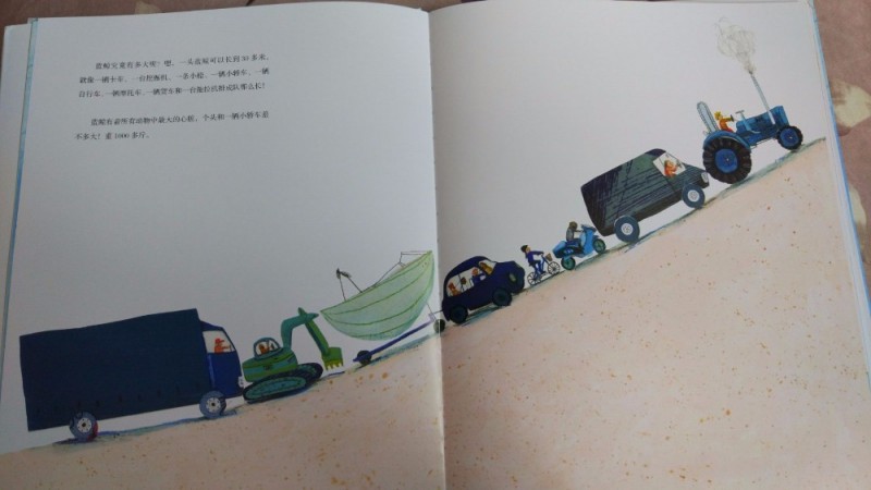 故事就以小男孩儿为主线而展开,他从书架上发现了一本关于蓝鲸的书,于是整本书便以一个孩子的眼光展开了对蓝鲸的科普探索!“蓝鲸有多大啊?”“这么大~”小家伙已经把胳膊伸到了“无穷大”,身子也随着慢慢在沙发上展开!接下来绘本以孩子们喜欢的不同类型的车辆排列来说明蓝鲸的长度,对孩子来说还有比这更形象的吗?而且蓝鲸的心脏个头和小轿车差不多呢,之后我们两个还一起用自己的拳头粗略地比较了我们的心脏!