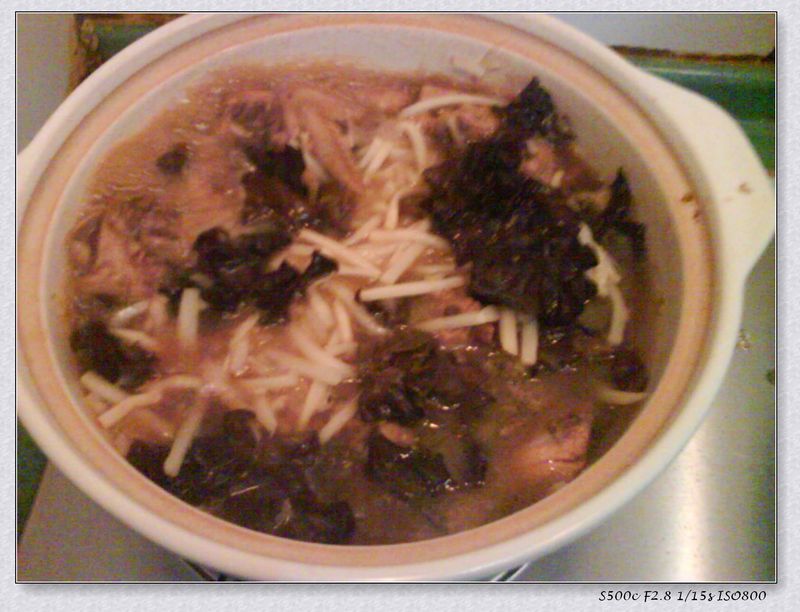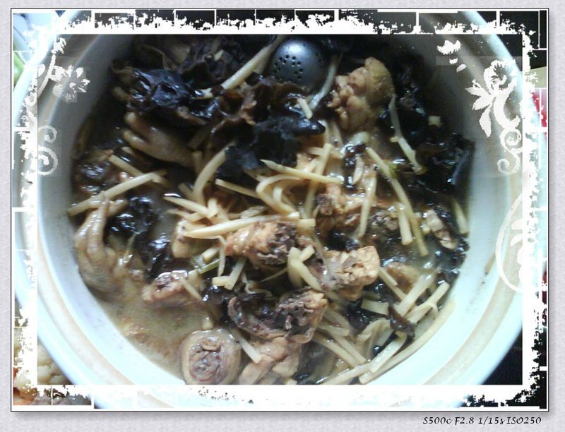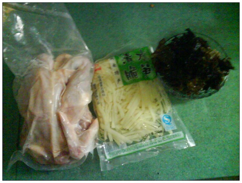 其实我不擅长做肉类,但是我最喜欢吃肉了,不爱做肉是因为不喜欢处理过程中的生肉味,闻过会很影响吃肉的食欲啊,所以啊我虽然最爱吃红烧肉和排骨,但是我却不会做。我挑战过的肉类大菜,主要有可乐鸡、炒鸡胗、五花肉炖鱼面、鱼头汤。因此这回趁着周末,赶紧买材料备下了食谱,不过虽然拍好了照片但是一直没写,眼看活动就要过期了,赶紧赶上,要不一番心血就白费了。好吧,闲话少说,开做,首先是配料:草原沙漠鸡(头一次买,感觉有点瘦小,肉少)、鲜笋丝一袋、水发木耳若干。