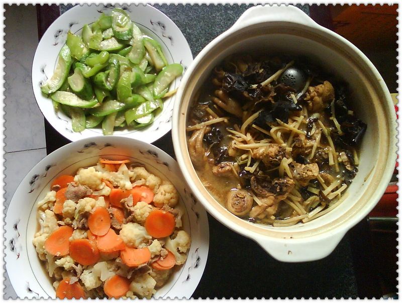 然后再配上尖椒炒丝瓜,碧绿碧绿的,肉片熬红萝卜菜花,红白相间,很漂亮吧,这就是全家的午餐,虎头很捧场,菜花、红萝卜、鸡肉都吃了不少,八月秀厨艺成功