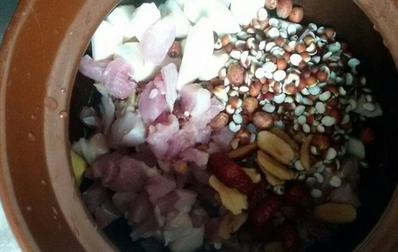 下面跟大家说一下芡实莲子淮山瘦肉汤的详细做法。 材料准备: 芡实50克、莲子50克、铁棍淮山200克、猪肘口400克、生姜三片、陈皮一小块、红枣7枚 步骤: 1、 芡实、莲子洗净,提前泡发,如没时间浸泡,则可用热水浸泡十分钟再煮,然后捞出备用; 2、 铁棍淮山洗净,削去皮,然后切成滚刀块,备用; 3、 猪肘口洗净,刮净猪毛和猪皮杂质,切块,备用; 4、 红枣洗净,去核,切片,备用;生姜、陈皮洗净,备用; 5、 砂锅洗净,然后把上述所有材料一同放入砂锅内,一次性加足清水大火煮,水煮开后再调成小火继续煲一个半小时; 6、 关火调入食盐搅匀即可饮用。