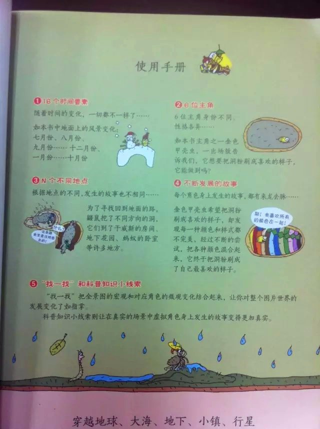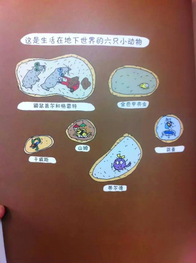 《你好!地下》这本书中向孩子们展现了一个生机勃勃的地下世界,这里有鼹鼠盖尔和格雷特、金色甲壳虫、于威斯、山姆、蒂尔德和跳蚤等各种各样的小生物(于威斯、山姆和蒂尔德这三个小生物至今我还不知道是什么品种,猜想可能是作者自己想象出来的生物吧),随着时间的变化,每个小生物都发生了不一样的改变,从七月份、八月份……一直到第二年的一月份至十月份,孩子会在书中看到发生在这些小生物身上的时间故事。