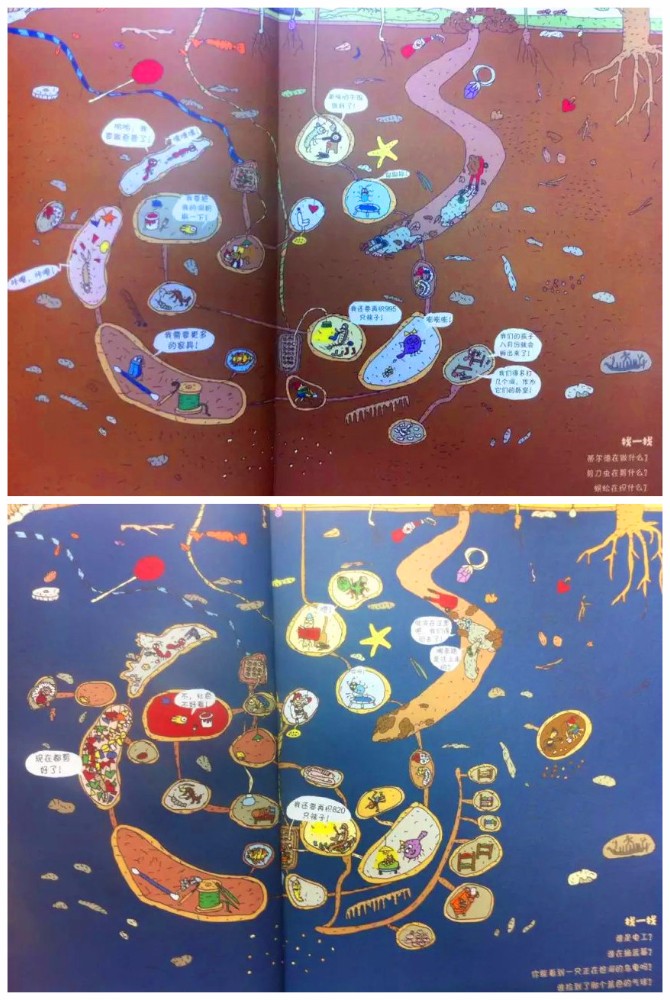 ![]() 通常,我们大人看到这种书的时候,第一反应是“怎么这么花啊”,甚至有些人还是“密集恐惧症”,特别怕这些密密麻麻的小东西。而孩子却不一样,他们最喜欢做的事情就是观察这样细微的小事物了。我家宝宝满一岁以后就开始在书中找她喜欢的或者在生活中能见到的图案,家里的地板或者沙发上一些细微的小东西她都会立刻发现,然后叫大人去清理干净。渐渐地我们家长会发现,孩子小的时候对这些细微的事物非常感兴趣,常常会发现一些大人发现不了的东西,感觉非常地神奇。而《你好!地下》这本书中,那些喜欢待在地下的小生物都非常的小,更别说他们手中拿的东西就更小了,孩子们拿到这样富有想象力的有意思的书,不喜欢都难啊!