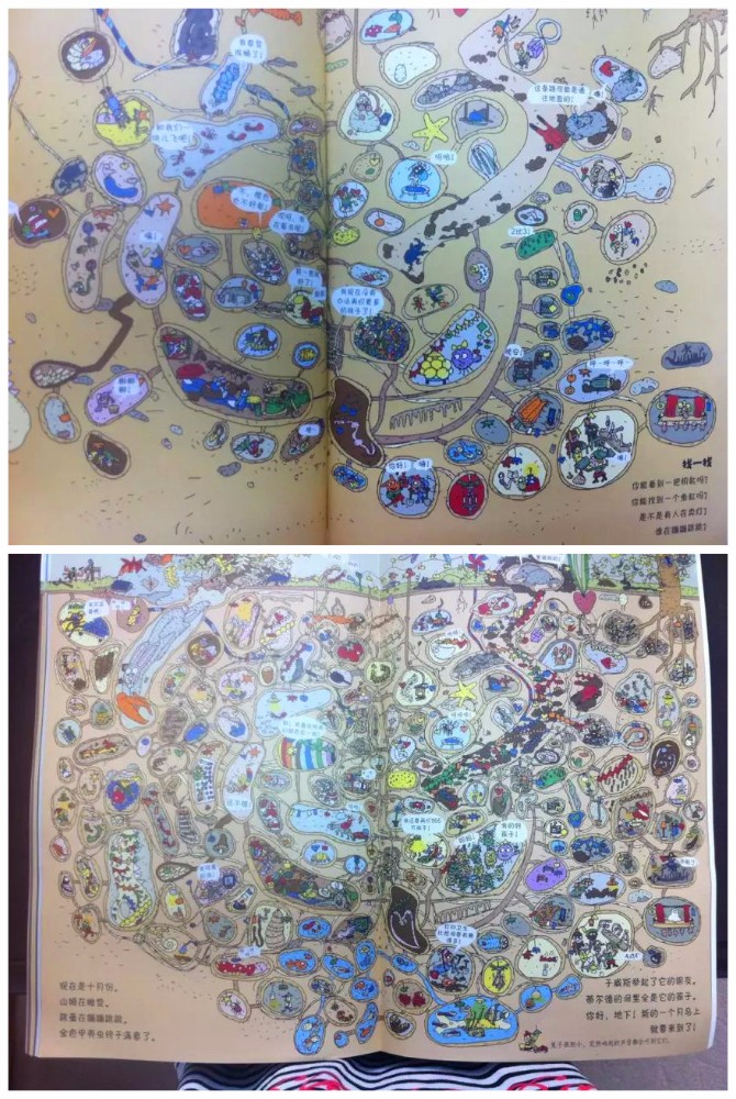 感谢宝宝地带和广西科学技术出版社•阳光秀美童书馆提供此书!我收到的是《你好!世界》系列中的一本《你好!地下》。刚打开包裹取出这本书的时候,我就感到非常地意外和惊奇,因为这本书比我之前收到的任何一本书都还要大,比A4纸的尺寸还要大出一截来,摊开以后就更加地大了,而且里面的图案密密麻麻的,画风也比较像涂鸦的手法,看惯了一些简单唯美的大图画书后再看这种类型的书,刚开始还真的有点不习惯呢。可当我静下心来,慢慢地从第一页开始翻阅以后,就渐渐发现其中的奥秘。这跟以往我收到的故事类绘本不同,这是一本可以让孩子玩游戏找找看的书,一本可以培养孩子想象力、专注力和思考力的书。