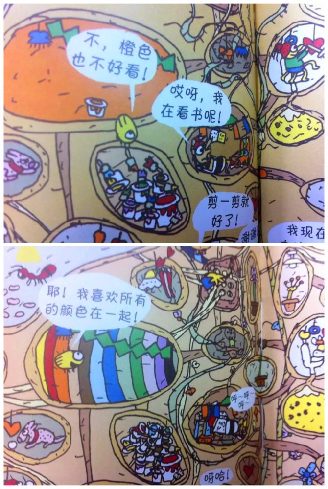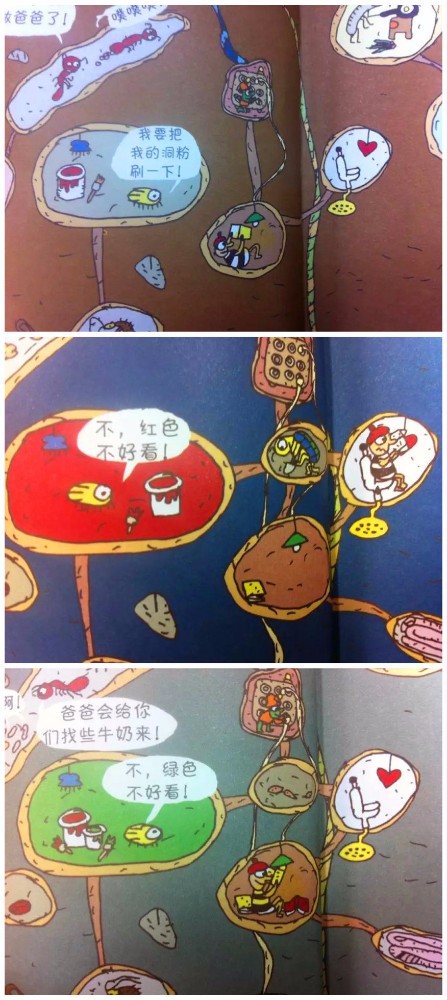 类似于山姆这样的小生物还有很多,每翻过一页,他们就会呈现与之前不同的变化。比如金色甲壳虫一出场时就想把它的洞粉刷一下,八月份时刷了红色,但甲壳虫觉得不好看;九月份时刷了绿色,也不好看;十月份时刷了棕色,还是不好看……就这样一直换颜色,甚至还换了条纹和网格,都不好看;直到最后甲壳虫发现,它喜欢所有的颜色在一起,组成彩虹最好看。这里面我还注意到了,一开始甲壳虫每粉刷一次,洞里就会出现那个颜色的油桶和粉刷,之后越积越多,洞里都塞满了,甲壳虫非常聪明,它新建了另外一个洞,专门存放这些用过的油桶和粉刷,真是太有创意了!