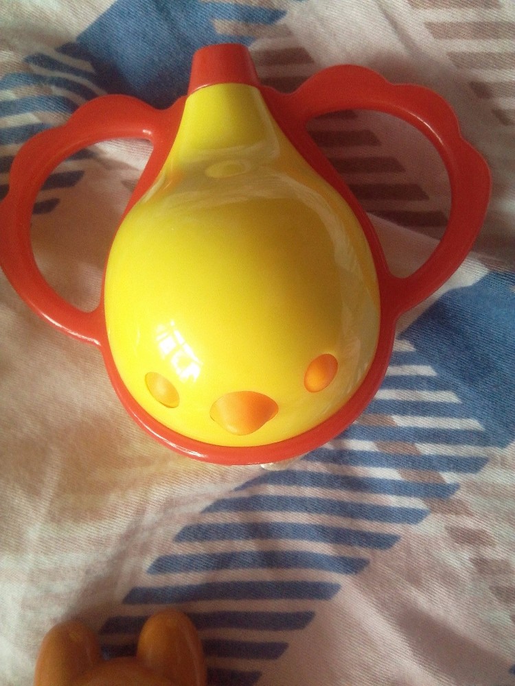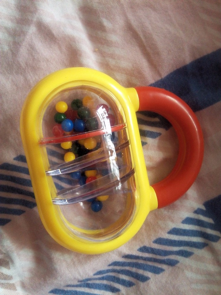 还有一个里面是有很多颜色的小球的,我知道这是摇铃,也没有太细看,后来我才发现居然是做成了沙漏形式的,很有趣,女儿小还不懂,儿子觉得很是好玩,抢去玩了好久,本来这是给女儿买的,结果这俩孩子还是儿子玩的多。还有一个有点儿大,女儿睡在床上的时候,拿着玩的,没拿好,打到了自己,那个委屈啊,哭,哈哈,真是孩子啊。