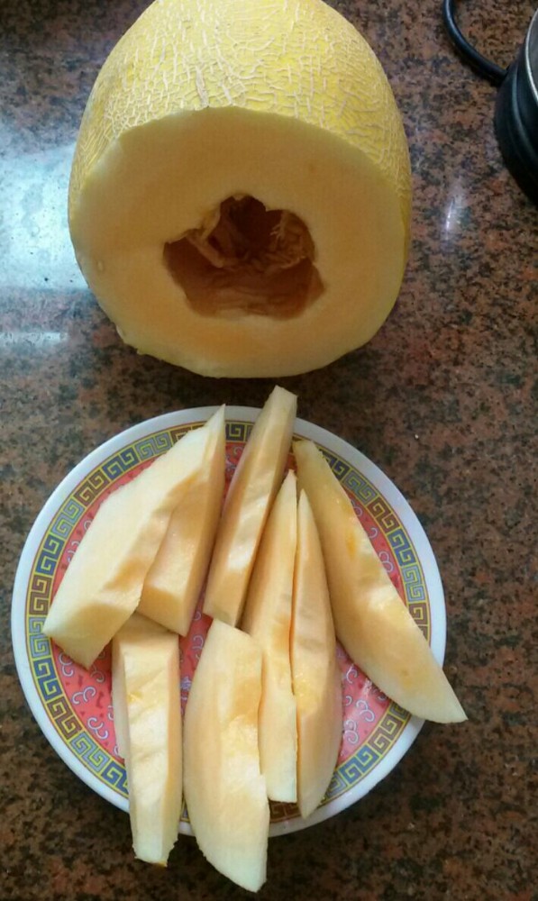 虽然我个人很喜欢吃香喷喷的哈蜜瓜,但考虑到现在还不是哈蜜瓜最好吃的时候,所以我今年一次都没有买。哪想到端午节第二天,宝爸却买了一只哈蜜瓜回来。看着这哈蜜瓜的外表好像已经很成熟的样子,可我把鼻子凑近闻的时候却没有闻到特有的哈蜜瓜味,于是我就猜测到宝爸买的这只哈蜜瓜还不是很成熟,加上当晚我们有西瓜吃,所以我就决定让它放一个晚上,打算第二天再吃。 哪想到我第二天上午准备拿出来切开吃的时候,却发现哈蜜瓜的瓜柄那有点黑,我仔细一看,原来是宝爸选的哈蜜瓜不太好,放了一夜的哈蜜瓜竟然想烂的节奏,然后我就赶紧把有黑点的那部分都切掉,然后才开始切哈蜜瓜,然后叫大家多吃些,以免哈蜜瓜放久变烂了会造成浪费。