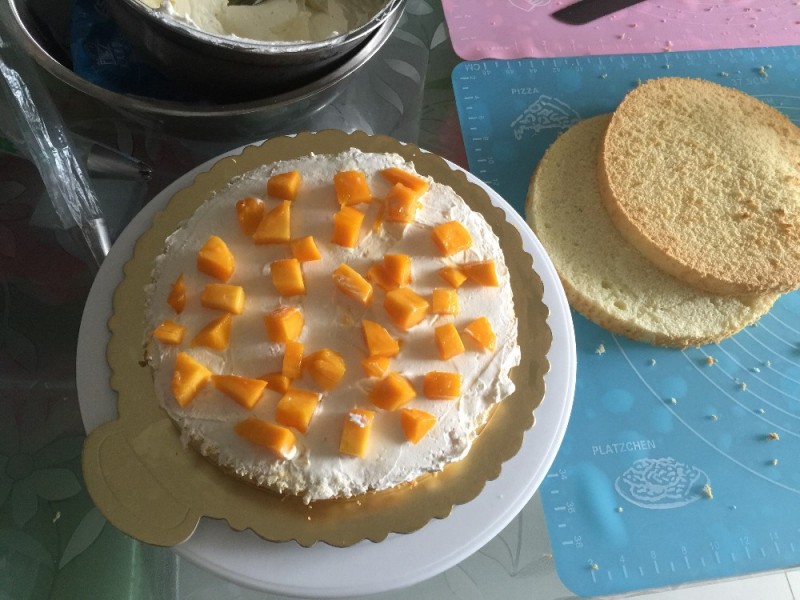 蛋糕开始裱花啦,戚风切成三份,依次抹上奶油,放上果粒。我放的是芒果,最近的芒果味道超好,很甜。