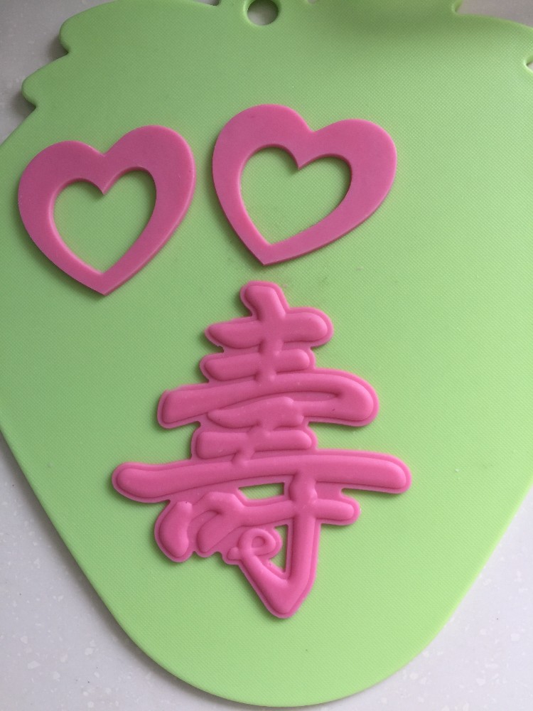 不过既然答应做了,那就要好好做,空闲的时候我也网上查了一些蛋糕图片,找一些好看又简单的蛋糕,太复杂的我可不会。研究了几天,到是有和个寿字蛋糕挺漂亮,不过太复杂,到是有一个巧克力做的寿字挺漂亮,也很大气,如果边上再用水果装饰一下应该不错,更重要的是简单。原来巧克力的寿字是要用模具做出来的,于是又淘了一些模具和巧克力。