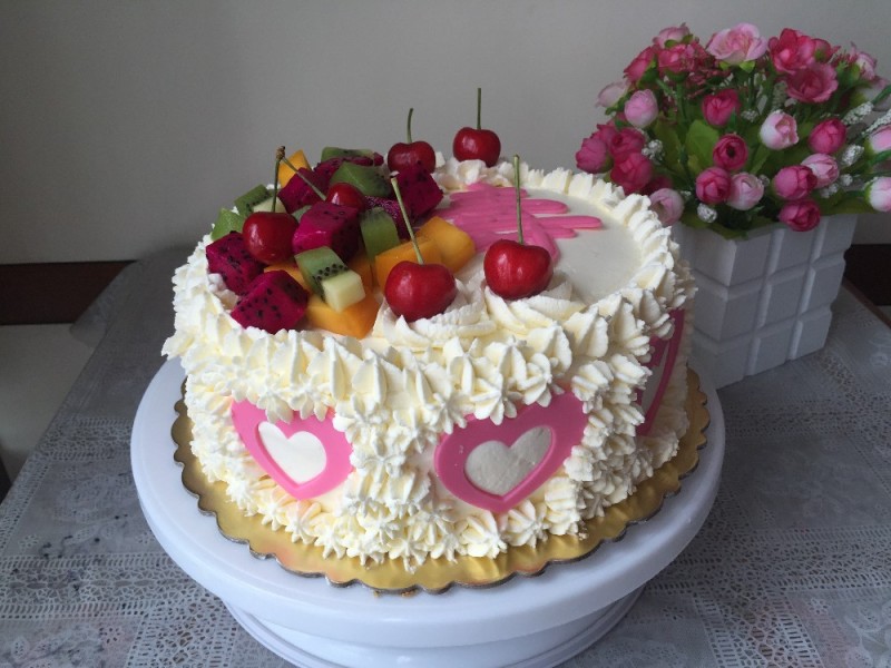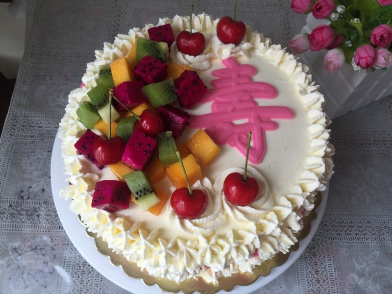 然后把整个蛋糕抹上奶油,抹奶油真不是我的强项,每次都抹不平,水平有待提高。把寿字放在右边,左边放上切成小方块的水果粒,边上再挤上奶油花。做这么一个蛋糕,看着挺简单的,算算需要花的功夫也不少,而且每次做完最讨厌的就是洗。再加上各种材料费,现在水果也是特别贵,说实话私房烘焙卖200左右还真不算贵。当然我是友情价,纯属帮忙,只收了成本价,就当给自己一个机会多练习,哈哈。