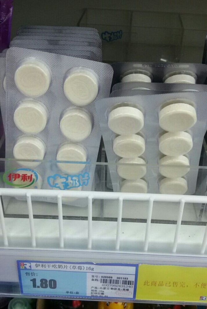 本来我是选伊利袋装的那种原味牛奶片的,可这家超市里竟然没有这种包装的牛奶片,但散装的牛奶片就有。可找来找去,我也找不到原味的伊利牛奶片,然后我就想选草莓味的牛奶片给小家伙,哪想到小家伙看到草莓味的牛奶片后竟然指着上面的小红点点说里面脏,然后就把它摆回货架上。虽然我有解释说这小点点不是脏东西,而是加工过的草莓,可小家伙还是不愿意接受这种牛奶片。 无奈之下,我只好给他选了伊利旁边的蒙牛的原味牛奶片,然后小家伙才高高兴兴地接受了。