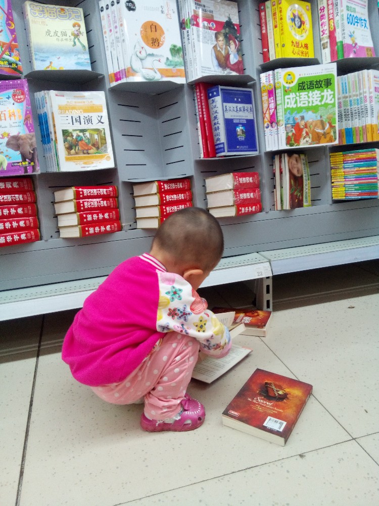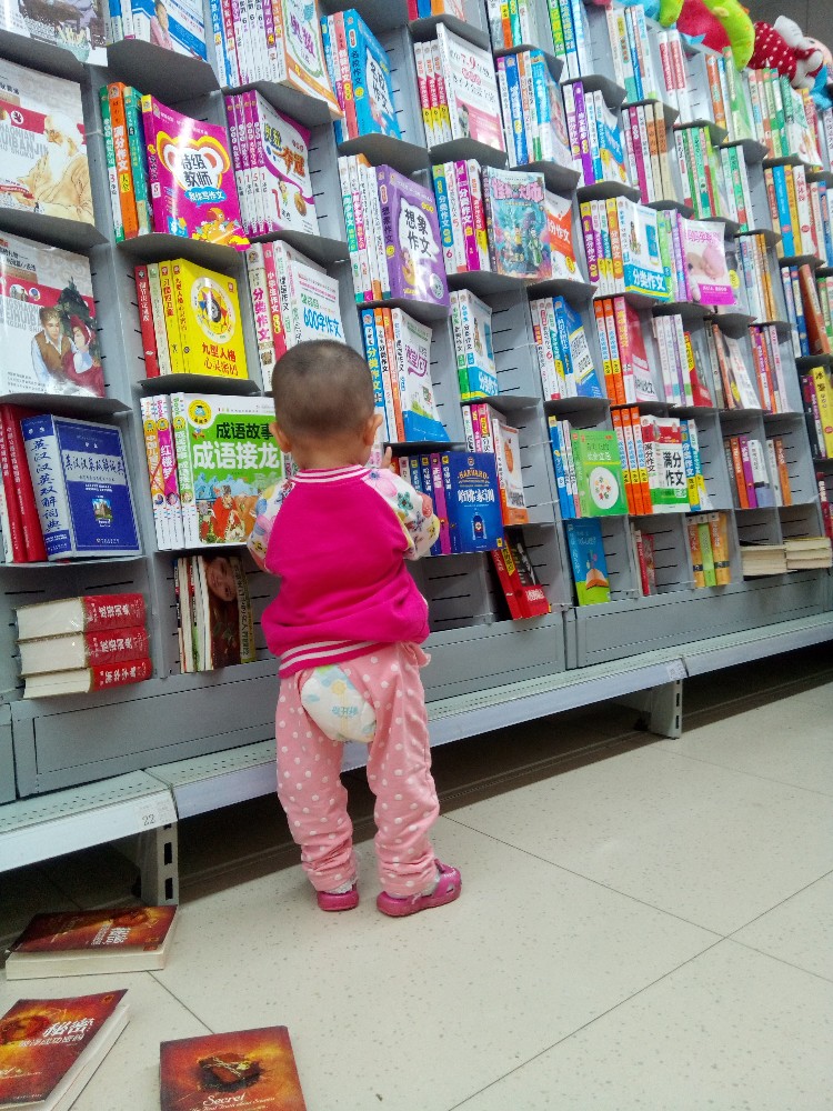 这个摆放书籍的货架上,放着从幼儿到成人的书籍,虽然种类不如书店里多,但是包含了各个方面的,都是非常常用的,比如幼儿圈圈书,这是幼儿认识物品之类的书籍,小学生的字典,故事书,都是特别经典的,大人的书籍就涉及好多方面,比如做饭的,为人处事,职场的,家庭关系的,还有各种心灵鸡汤。这些书籍总是能吸引附近的好多小朋友去看书,每次走到这里,都能看见好几个小朋友或是坐着或是蹲在书架旁边翻看喜欢的书籍。我家的宝宝也特别喜欢看书,一看到这些书,赶紧跑过去,翻翻这个,看看那个,抽下来一本,蹲在地上翻几页,觉得不适合自己,赶紧换个地方接着找书翻。我跟在后面,把她抽下来的书再摆放回去,宝宝真是能折腾,每一个能够得着的书都要看看,周围的人看见都很多好稀罕,这么小的宝宝对书这么着迷。婆婆说宝宝在书架子前面跑着找书的样子,特别像个小学生!