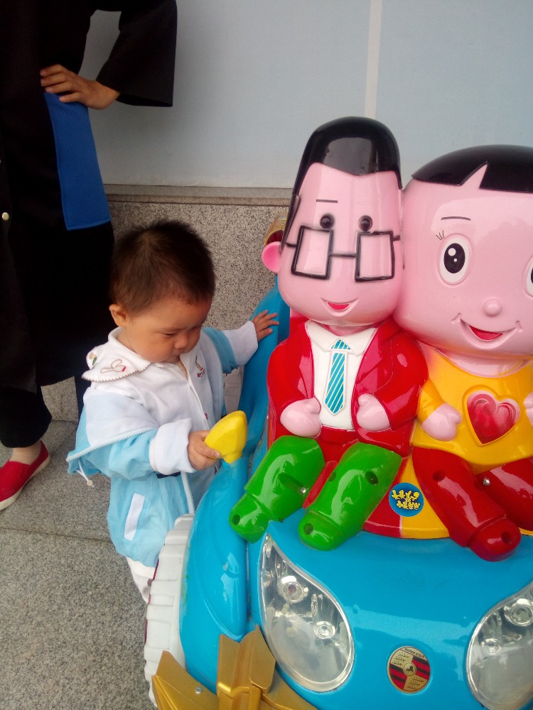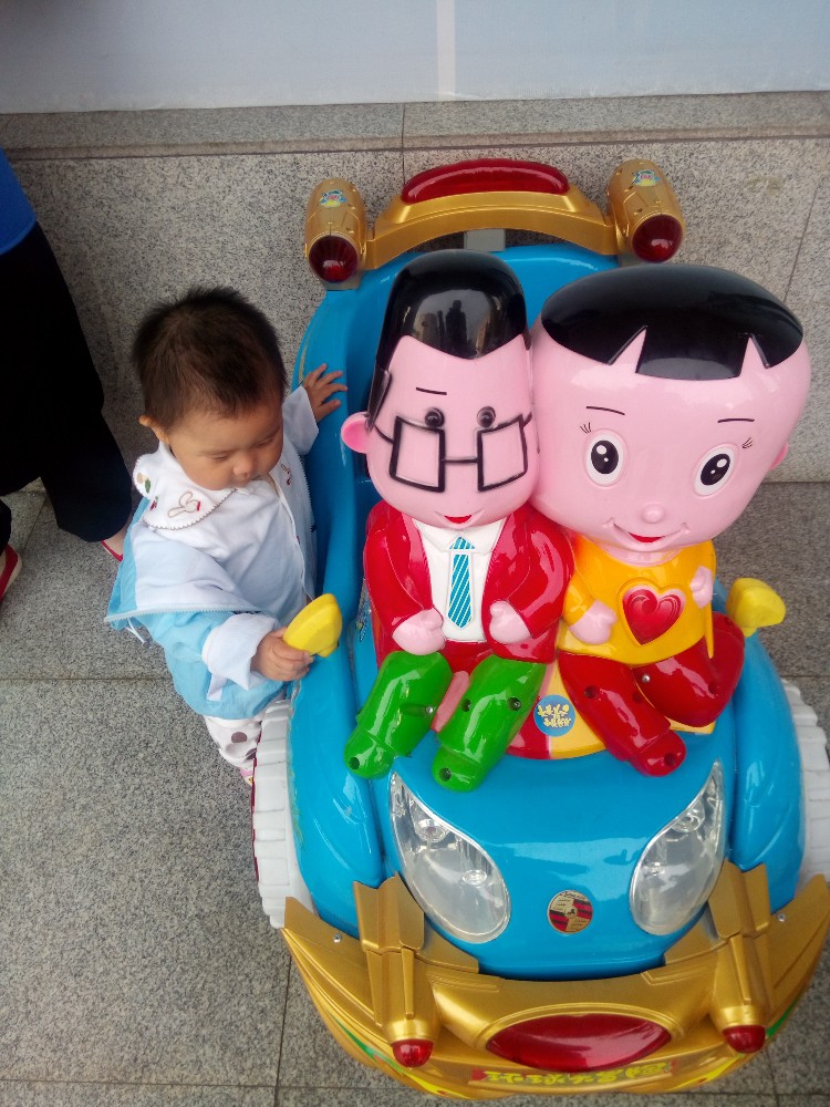 平时不加班的时候,喜欢带着宝宝去小区门口的超市转转,一来是打发时间,二来让宝宝多接触人和新鲜事物。 超市门口放着几个晃晃车,带了很多的灯,晚上看起来非常漂亮,孩子都喜欢走到门口的时候停留在那里坐一会,我家宝宝在奶奶的教导下,九个月的时候就会投币了,给她一元硬币,自己就赶紧往投币口里塞,等着小车放音乐,等着小车晃来换去。在大人看来,这样摇晃着好像是没有多大的乐趣,不过孩子都特别喜欢,生产这种东西的商家真是了解孩子。不过一次一元钱还是都挺接受的。之前涨价到两元,后来不知道怎么回事,都改为一元了,一般一元钱大概就是两分钟的样子吧。宝宝玩这个之前,都会在这一排小车前面转悠一下,看看这个,摸摸那个,看哪个漂亮,就坐哪个。