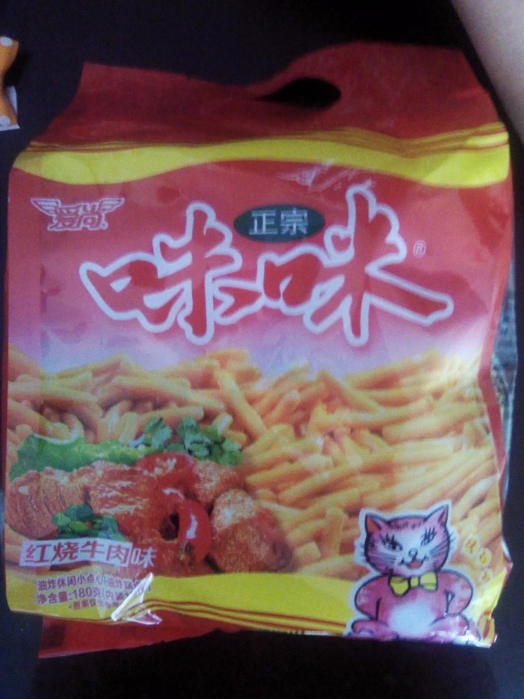 买了一袋咪咪虾条,只是这字体有点儿想味咪,有点儿小郁闷的,中国啊,仿货太多了啊。我记得以前的虾条就是虾的味道,没想到这次买的居然是红烧牛肉味的,嘿嘿,这是让人没有想到,一袋180克,一共10包,儿子要吃,我拆给孩子吃的时候,顺便也尝了一下,吃着倒是还可以,可惜找不到小时候的那种感觉了,总觉得这个味道太鲜,感觉想味精什么的好多,没有小时候吃的味道好,儿子倒是很喜欢。