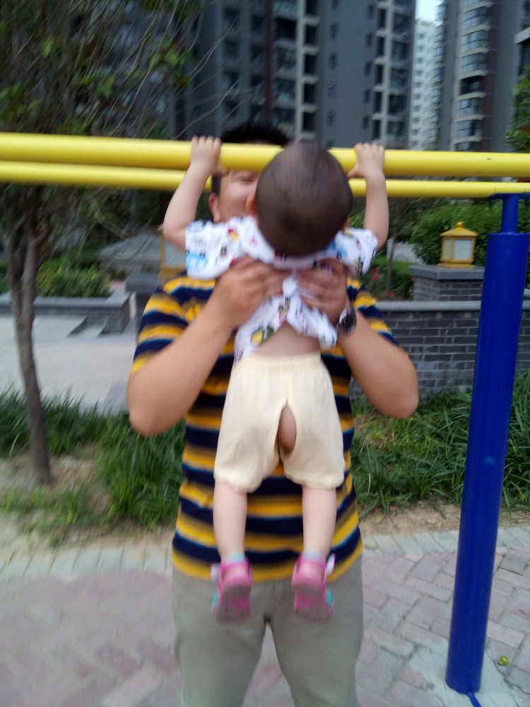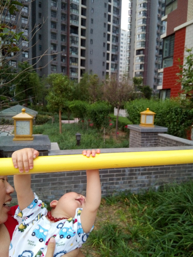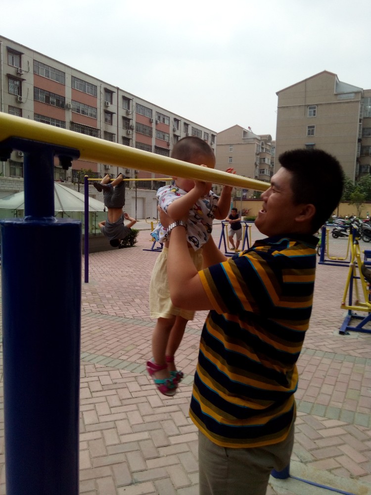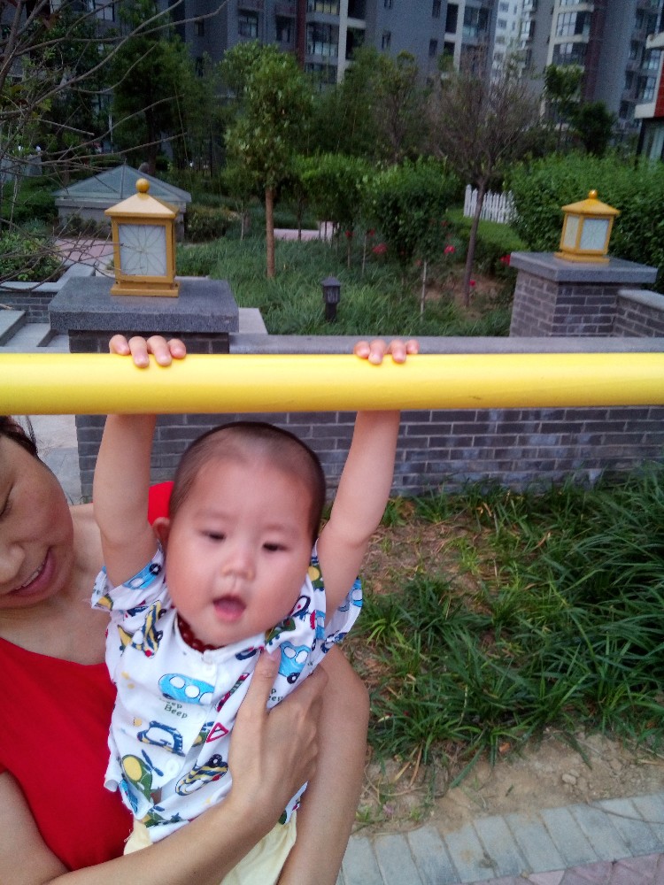 有个大人在单杠上健身,各种撑起,宝宝看了好一会,自己跑到双杠下面,示意我抱起她,我就把她抱起来,举到双杆的杆下面,宝宝赶紧双手拉起,头向后仰,这个动作是别人玩这个的时候做的,真是学习能力好强。我和宝宝的爸爸分别替换着让宝宝在双杠上玩了一会,等宝宝转移了兴趣才放下来。
