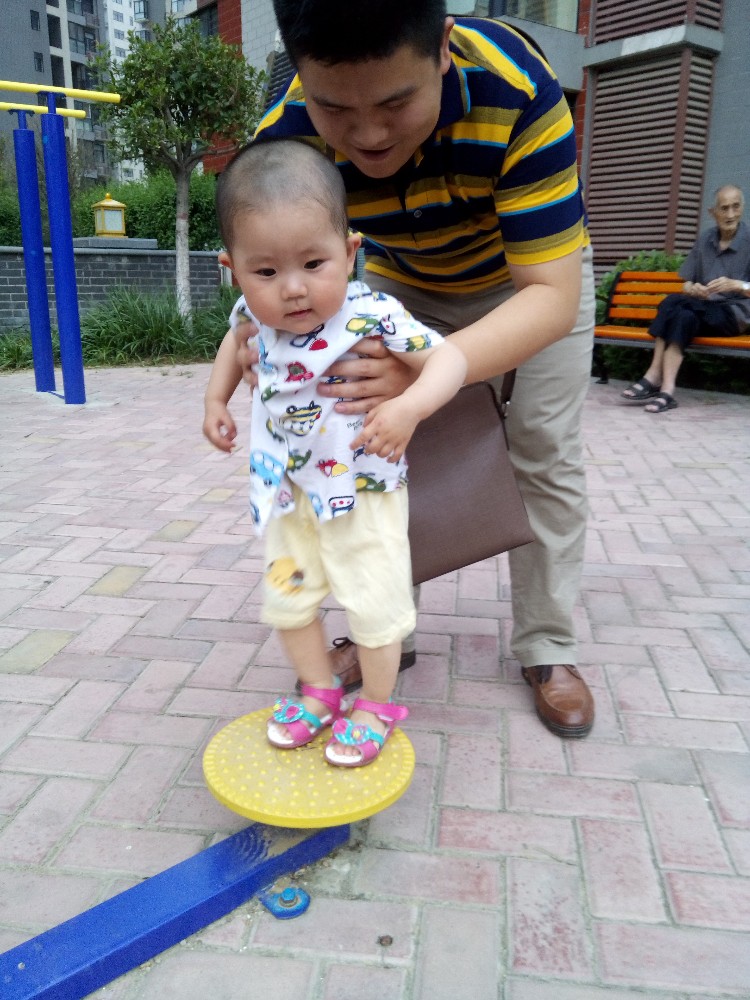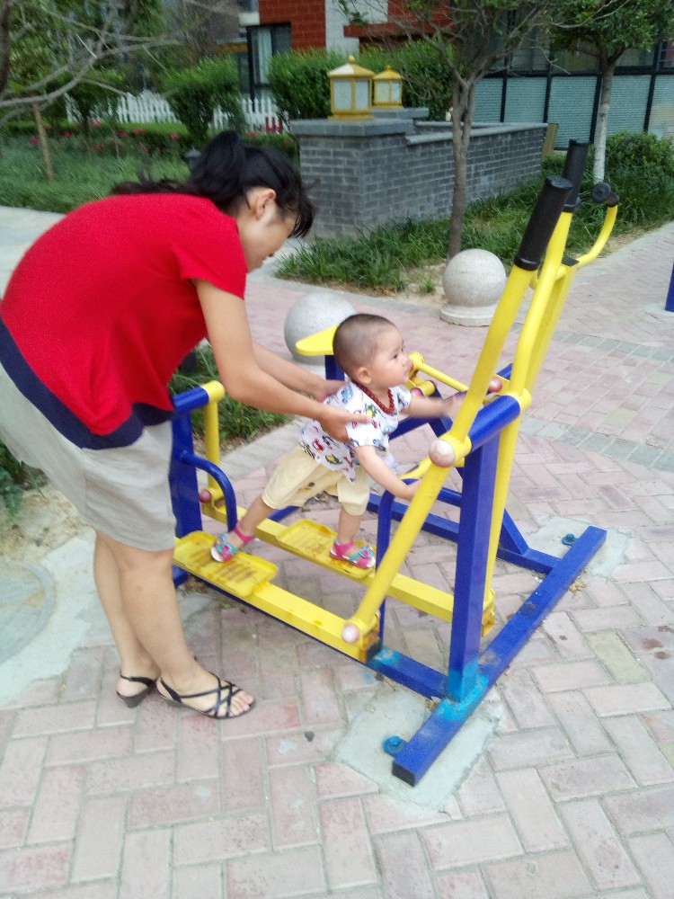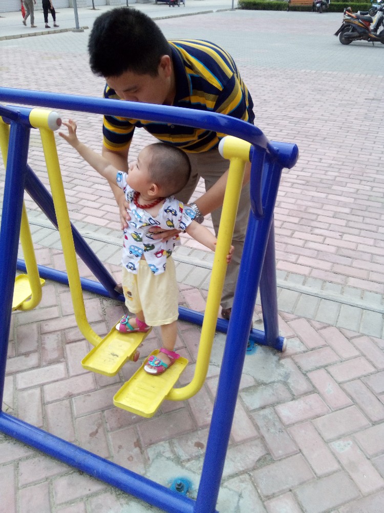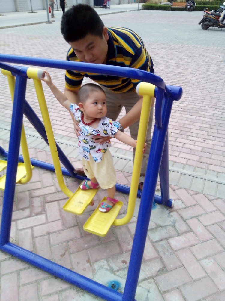 我把包和宝宝的水杯之类的收拾好放在凳子上,老公抱着宝宝玩起了健身器材,宝宝非常好动,很喜欢这些东西,看着别人怎么玩的,就开始模仿起来。这个扭腰的是宝宝很喜欢的,宝宝喜欢让大人扶着,站在上面不停的转动,因为她看见别人也是这样玩的,站的累的就自己坐在上面转圈。