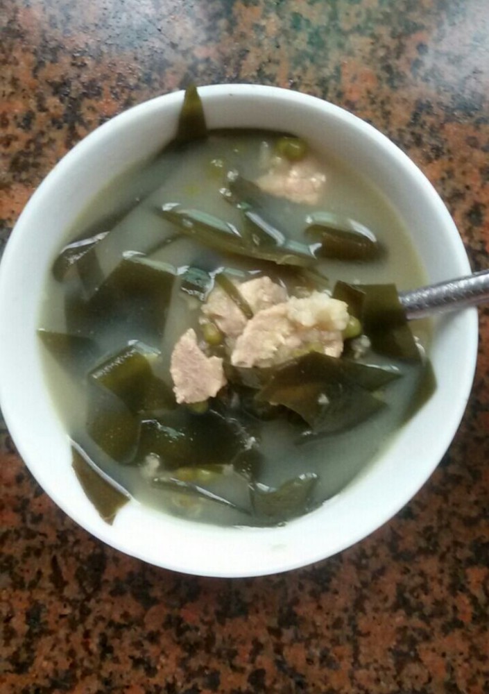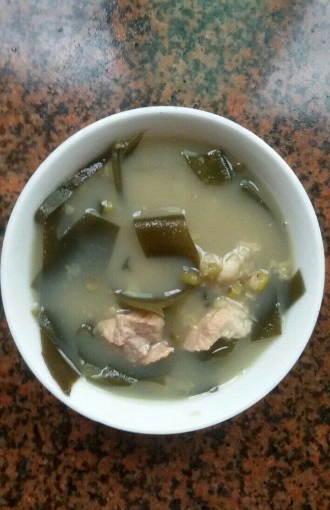 下面简单跟大家说一下绿豆海带瘦肉汤的做法。 材料准备: 海带约60克、绿豆200克、猪瘦肉250克、生姜三片、龙眼肉适量 步骤: 1、 海带提前浸泡一个小时,然后刷去其杂质并用清水洗干净,然后把海带切小块,备用选海带时大家最好选一些新鲜的、而且看起来肉比较厚的海带,这样的海带不但口感好,而且清洗起来也特别的方便); 2、 绿豆洗净,备用;生姜、龙眼肉洗净,备用(刚开始时我是放100克绿豆进入煲汤的,可宝爸嫌绿豆少,然后就继续放了100克进去煲,正因为这样,才使得这绿豆海带瘦肉汤特别的浓稠和好喝); 3、 猪瘦肉洗净,切块,然后放开水内焯一下,捞起备用; 4、 砂锅洗净,然后把所有材料一同放入锅内,一次性加足水大火煮,水煮开后改小火,继续煲一个小时左右即可关火; 5、 调入食盐、适量的花生油和胡椒粉即可饮用。