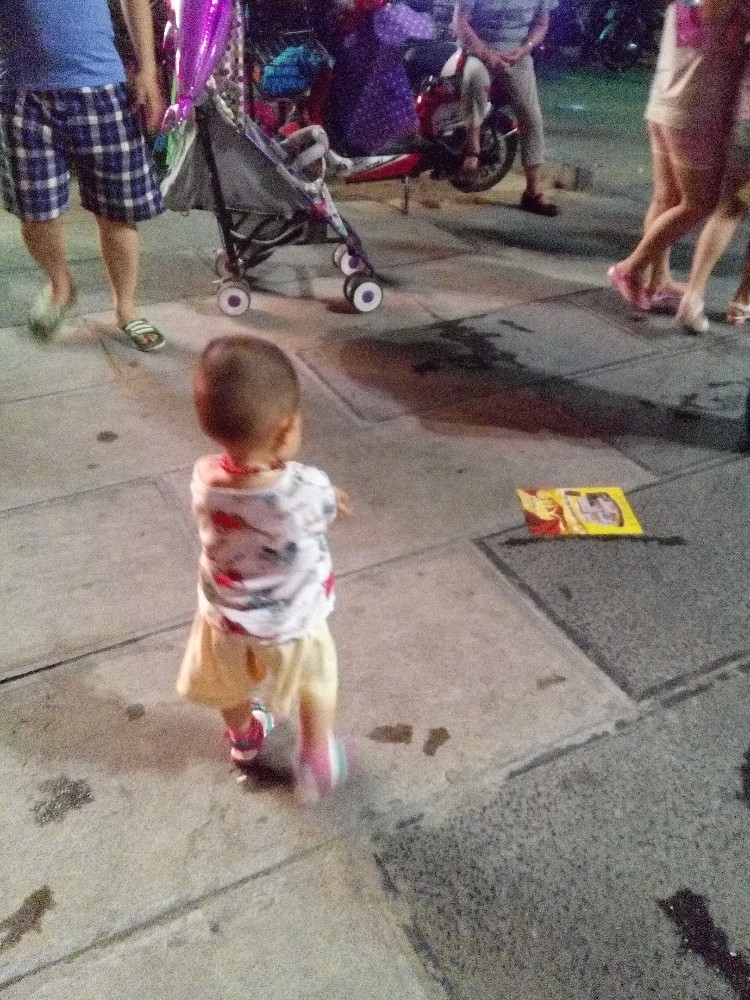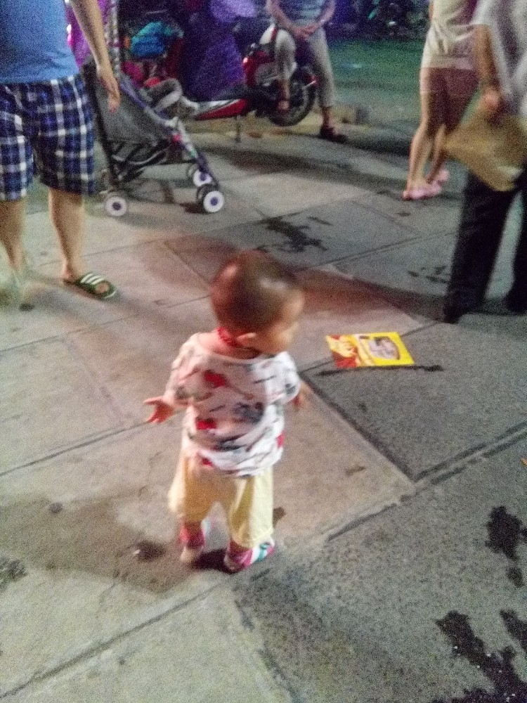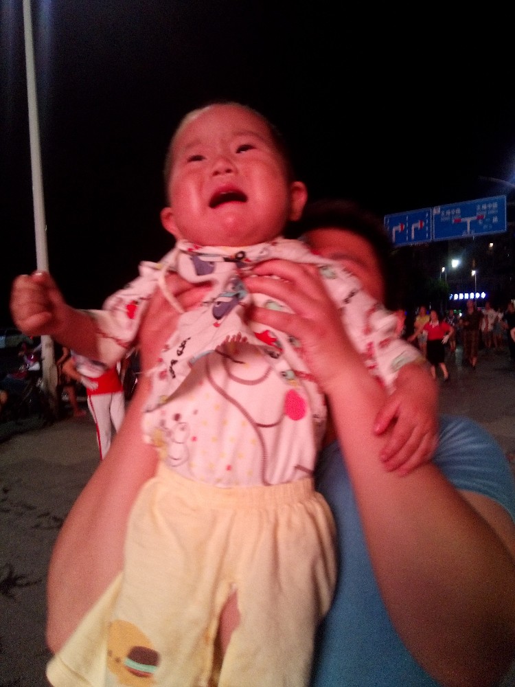 昨晚上老公开始看着宝宝,我推着小车,宝宝开始还是站在旁边看着,自己晃动着,一会就开始往人堆里扎,老公跑过去拉着,抱着宝宝离得远了点,放下来接着看,宝宝再跑到人群里,这么重复了好几次,老公累的一头汗,我换过来带宝宝,老公推着小车,宝宝在我旁边站着看着,看一会就开始往人群里跑,想跟着跳舞呢,我把她控制在群人外面,一直盯着,真是一眼都不敢离开视线。