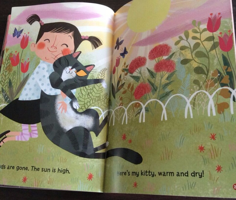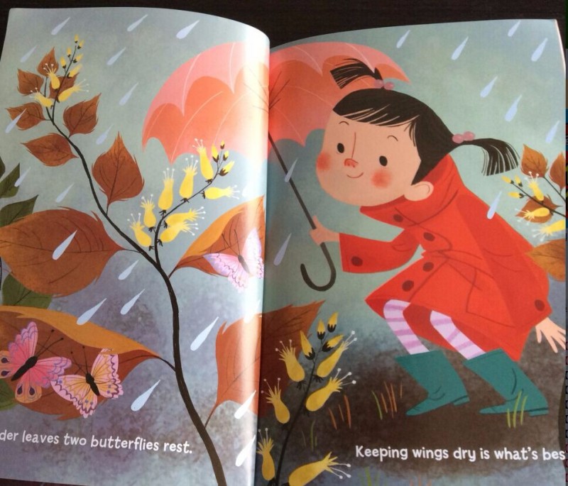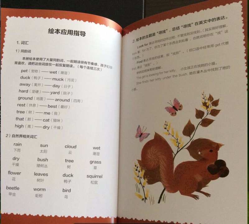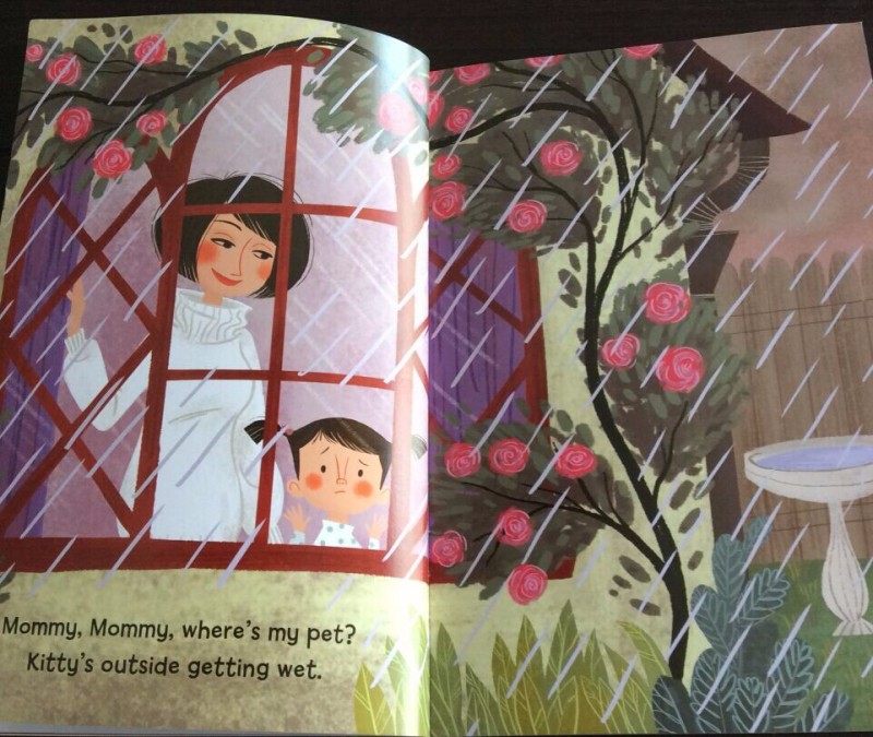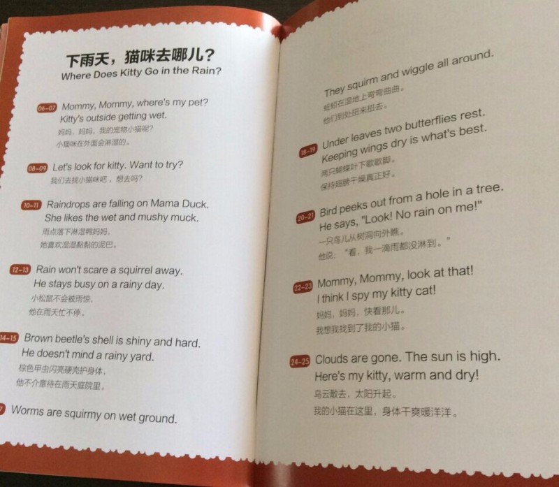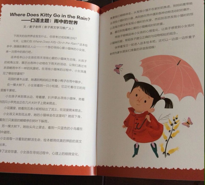 ![]() 给宝贝英语启蒙已经快一年了 ·在这一年里面和宝贝一起读过不少的英文书籍,有原版的绘本,有国内出的分级阅读,可以说再英文启蒙绘本方面,我家宝贝是见多识广的!而当我把这本口语泡泡堂放在宝贝眼前的时候,宝贝还是充满惊喜的打开这本书,说:“妈妈你看这本书太有趣儿了,封面史昂吗的英文字母都卷成了一朵朵的雨花呢!真漂亮!”哈哈,原来宝贝是被封面的设计吸引了,可是当孩子再打开书的时候,已经充满惊喜! ![]() 打开扉页,一直可爱的猫咪藏在一个灌木丛下面!一个穿着红外套 打着粉色雨伞的长着猪鼻子的女孩子出现啦!不知道画家为什么把这么漂亮的女孩子画成猪鼻子呢,是为了让孩子们觉得有趣吗?哈哈,下雨天是我们夏天经常出现的天气,孩子们很容易去感受这种天气呢!下雨天小朋友们都喜欢待在家里,可是不得不出去的时候,大家都会打雨伞,穿雨衣雨鞋出去!而这个女孩子说:'where does Kitty go in the rain ?" 下雨天,猫咪去哪里了呢? ![]() 大雨大雨哗啦啦,Mommy Mommy ,where is my pet ? Kitty is outside getting wet !这两句非常的押韵呢,押的是t的音!孩子们会发现不仅仅是中文的诗歌会有 押韵,英文 的句子也是可以非常的押韵的!而且读起来朗朗上口 非常的好听! 看女孩子焦急的表情,就知道她是非常的担心自己的Kitty 英文中 猫是cat 但是在孩子们的口中 猫咪 可以用Kitty 这个单词! ![]() 妈妈非常的理解宝贝对于自己的宠物的关爱,于是给宝贝穿上外套,再给了她一把雨伞,让宝贝自己去雨中寻找自己的kitty Let`s look for kitty ,want to try ? 这两句也是很押韵的哦! ![]() 在寻找kitty 的过程中,女孩在雨中发现了很多的乐趣,她发现了忙碌的squirrel xihuan xiayutian de Mama Duck Baby Ducks 还有身上发光的 Brown bettles 还有在树叶下面躲雨的butterflies ![]() 雨停了,太阳出来了,宝贝找到了自己最爱的Kitty 好开心呢! Clouds are gone ,The sun is high . Here `s my Kitty ,warm and dry !孩子们最喜欢这一页的kitty 一只眼睛睁着 一只眼睛闭着,非常的可爱呢!这几句读起来非常的押韵好听呢! ![]() 书后面对于文中的内容都有相信的翻译,每一页都标清了页码,让没有英文基础的妈妈们可以充满自信的来辅导孩子阅读这本书啦!对于可以自主阅读的孩子,这也可以帮助孩子更好的了解这本书的内容! ![]() 故事讲完了,书后面还有亲子推广人关于本书的推荐,真的是非常的好,让我们对这本书就理解的更加的深入,发现了这本书更多的美! ![]() 绘本应用指导从 同韵词 自然界的相关词汇 都做了总结,让没有英语基础的妈妈们也能够更加自信的陪孩子阅读了! ![]() 书的封面说这本书还有外教朗读的MP3 还有中教讲读的MP3 让孩子能够声情并茂的学习英文有声绘本,真的是非常棒呢,买了这套书回家,就等于请回了优秀的英文外教加中教专家!真的是太棒了!赶紧去当当看看喽! 当当购买链接: http://product.dangdang.com/23916078.html 本作品未经作者许可不得转载,转载请征求作者意见。擅自转载使用,将保留追究其法律责任的权利!
