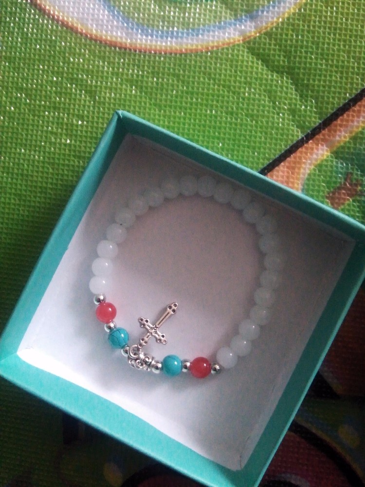 打开一看,怎么是手链?我瞬间有种蒙了的感觉,我明明拍的是项链啊,这是怎么回事,赶紧拿出了手链,哦哦,原来项链在手链的下面啊,吓我一跳,还以为卖家发错货了呢,原来这手链是送的。白色的手链,上面还有个十字架模样的算是小吊坠吧,白色给人很纯洁的感觉,漂亮,我还试戴了一下,嘿嘿,喜欢。