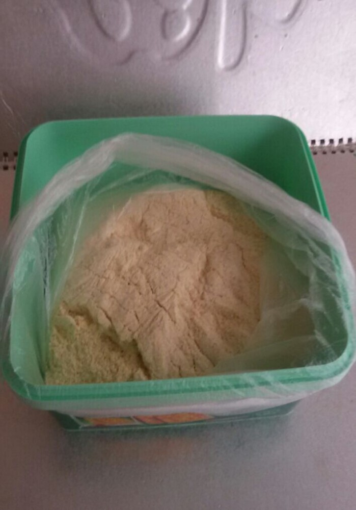 这饼干盒子里装的是玉米粉,也是用机器打成的,平时可以把它当米糊那样做来食用。