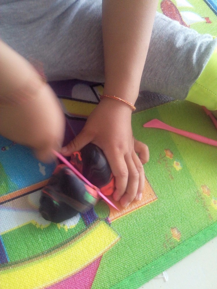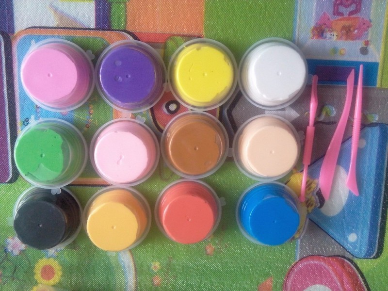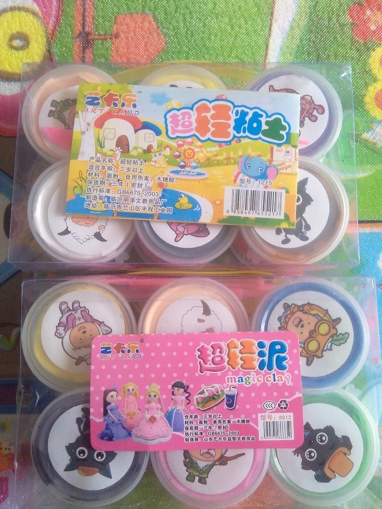 盖子盖的有点儿紧,儿子打不开,求助于我,我干脆把12盒全部给他打开了,颜色很艳丽,喜欢,我一直都知道粘土和橡皮泥是不同的,但真的没有接触过粘土,好好的看了下,手感不同,也特意闻了一下,没有任何的味道,不像橡皮泥味道很重,这个倒是让人很放心的。