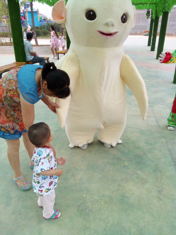 这群人里有两个布偶人,这么热的天气穿这个做宣传,还真是挺辛苦的,她们站在那里一直给路过的人招手,打招呼,招呼大家过去看看,现在天气气温在30多度,我们穿这么凉快,还很多闷热呢,路上能过去的人很少,真是不容易。我们抱着宝宝走过去,在旁边先陪着宝宝看看,宝宝不知道这是什么人物,左看看右看看,婆婆抱着宝宝来到其中一个布偶形象旁边,那个扮演布偶的小妹妹就开始给宝宝打招呼,挥动布偶的手,给宝宝做飞翔或者鼓掌的姿势,宝宝还是有点害怕,还是谨慎的观察,最后婆婆拉着宝宝的手,让宝宝摸摸布偶的耳朵,宝宝开始不敢,总是躲躲闪闪的,后来经过婆婆的几次鼓励,宝宝也耐不住好奇心了,开始自己摸了摸,非常开心,然后忍不住又摸了一下。