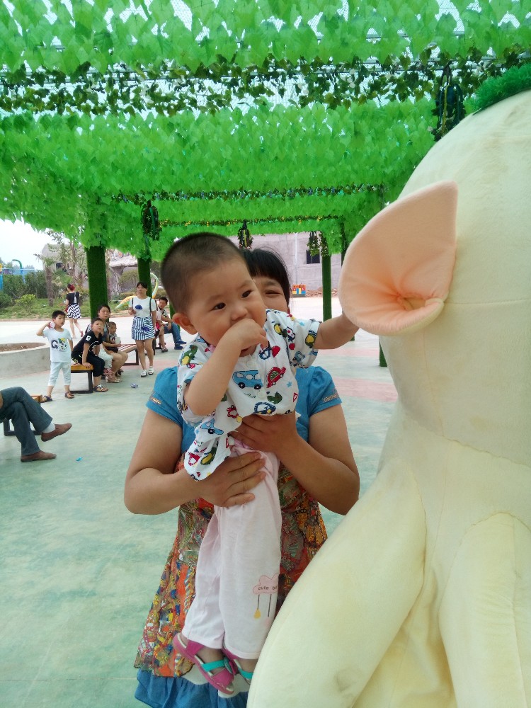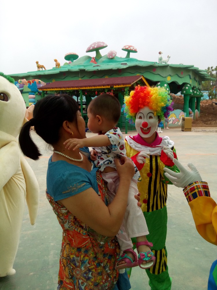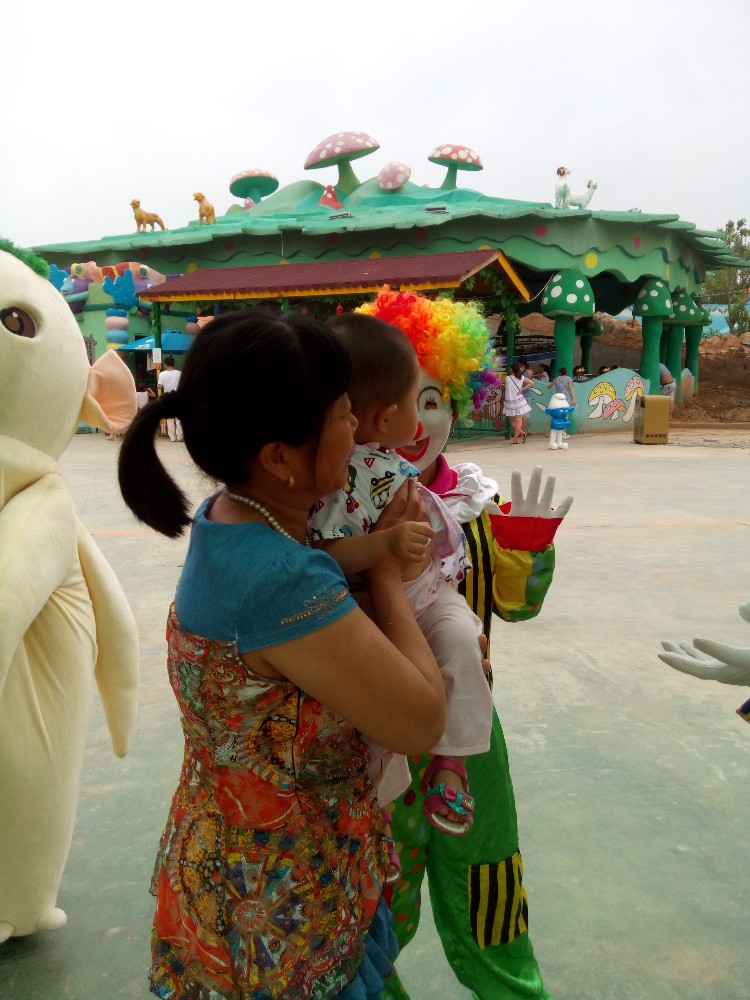 我们围着这几个工作人员转了一圈,宝宝看看这个,看看那个,最后和扮演小丑的工作人员合影了,扮演小丑形象的工作人员有两个,其中一个在路边给大家招手,招呼客人,还有一个在宝宝身边,和宝宝逗着玩,宝宝疑惑的看着这个打扮的很怪异的人,不知道怎么回事。这个小丑的形象是头戴着五颜六色的发套,头发比较长,颜色鲜艳,非常显眼。穿的配套的衣服也非常漂亮,很卡通的形象。宝宝对那个穿着布偶形象的人不是太害怕,对这个小丑形象还是保持很大的戒心,宝宝不肯离小丑形象的工作人员很近,一直趴在婆婆身上。等宝宝长大了以后,宝宝慢慢懂得了这都是装扮,就会不害怕了,现在还是给宝宝留一点好奇和新鲜感吧。
