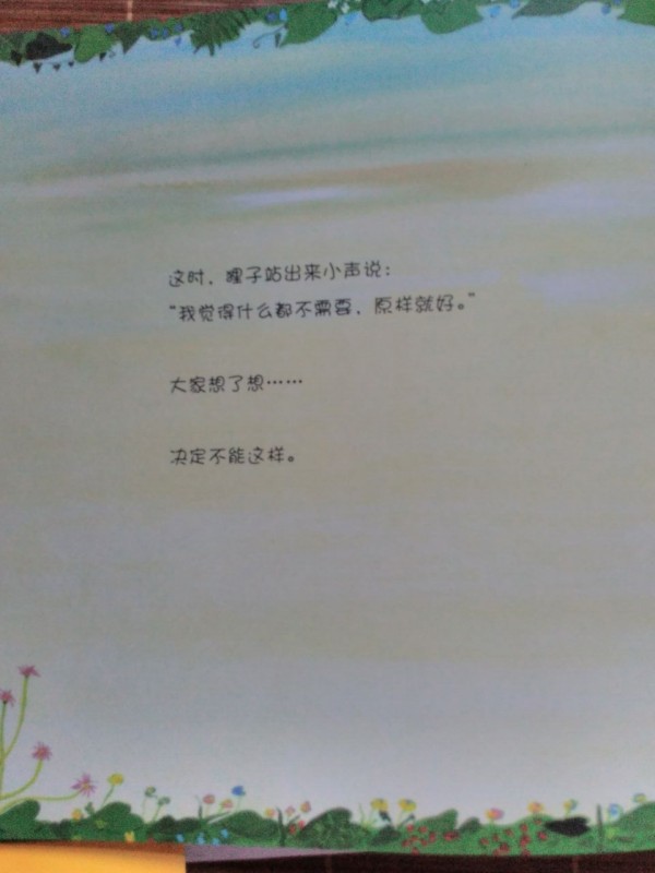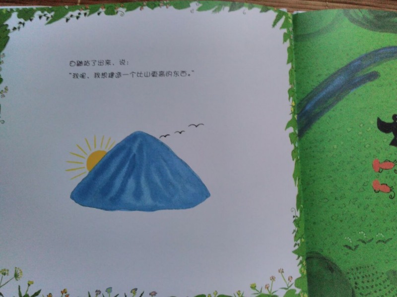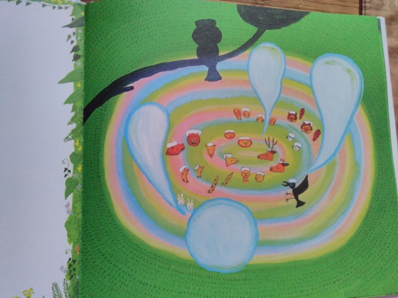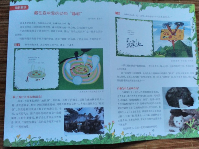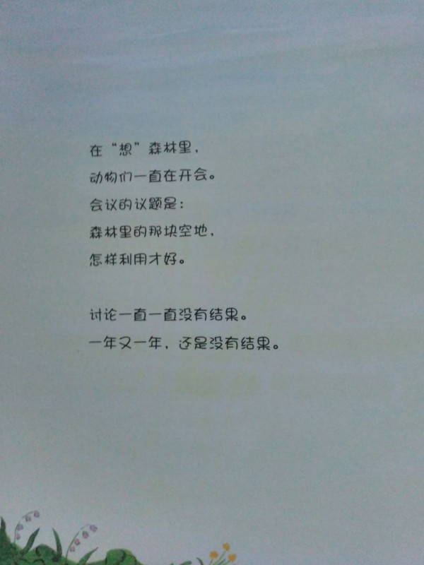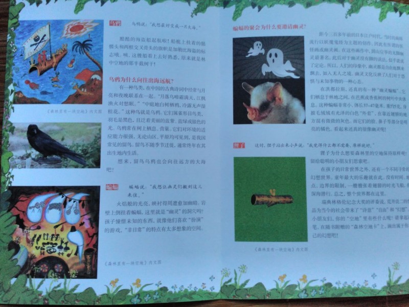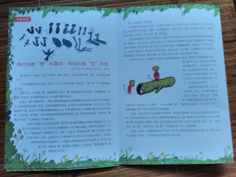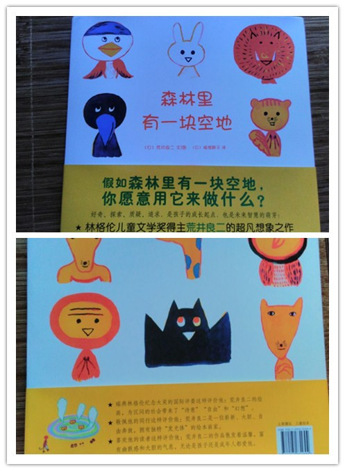 ![]() 这是我第一次参加地带分享活动,这次的分享活动是飓风社组织的,分享的绘本是《森林里有一块空地》,非常感谢宝宝地带,感谢飓风社,让我第一次参加分享活动就有好运。《森林里有一块空地》是日本荒井良二绘著,日本猿渡静子翻译的精彩绘本,在此次分享活动之前,我并不知道荒井良二,通过分享活动,了解了他是一个很有童心的绘本画家,他的很多画都是色彩鲜明,只看一眼就能深深的被吸引住,他的画有点像油画,而且他是一个很幽默的画家。但是《森林里有一块空地》这本书的风格却和他其他的绘本不一样,下面就跟着我一起来看看这本书吧。 ![]() 这本绘本是精装本,而且是1/12大开本,收到书后真是大大的惊喜呢。书的封面背景是很干净的白色,上面有可爱的小动物,而且书的外面还有一个封皮,精装版的书籍就是讲究呢。 ![]() ![]() ![]() 故事发生在一片叫做"想"的森林里,在这片森林里有一块空地,那么问题来了,如果有一片空地,你会用来干什么?相信每一个人都有自己的想法,如果是我,我会用来种上自己喜欢的蔬菜和果树,我问了我家宝宝,她说她要在空地上玩,真是小孩子的本性啊,总是忘不了玩,不过她又联想到有些草坪上有“请勿践踏”的提示牌,所以她说如果那里树的有牌子不让在上面玩,而这个牌子又倒了,她会把牌子扶起来让来到这片森林里的人都看见。我不得不佩服孩子的想象力,那么,森林里小动物们想在这片空地上干什么呢? ![]() ![]() ![]() 小动物们对这片空地的用途各抒己见,猴子最先提议在空地上建一个温泉,这是一个有趣的提议,也让大家展开了猴子是不是喜欢泡温泉的讨论,而通过飓风社-碧沙的讲解,我们了解到在日本长野的“地狱谷”,真的有一座猴子的温泉,真是长见识了,猴子建温泉的提议得到了大家的赞同,但是不一会儿白釉说想建造一个比山更高的东西,动物多了,就会有不同意见呢,乌鸦想把这片地变成一片海,蝙蝠想让幽灵都搬到这里住,大家对这些意见一个个的肯定,又一个个的否定,人多了意见就是不容易统一呢。最后一头年闯进来,打破了大家的讨论,小动物们一哄而散,关于这片地究竟用来干什么还是没有最终答案。 ![]() ![]() ![]() ![]() ![]() ![]() ![]() 故事的最后很让人意外,也让小朋友们有"为什么小动物们害怕牛"这样的疑问,这只能自己去想像了,所以这本书是启发提高孩子想象力的好绘本呢。在这本书,还要附赠的森林空地卡以及导读手册,在空地卡上孩子可以根据自己的想法随意利用,而导读手册上不但有“想"的森林的介绍,还有一些小动物们的科普知识,很是值得小朋友好好阅读呢。 ![]() ![]() ![]()