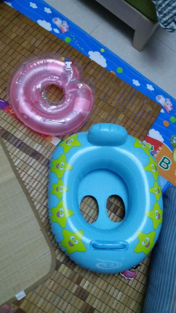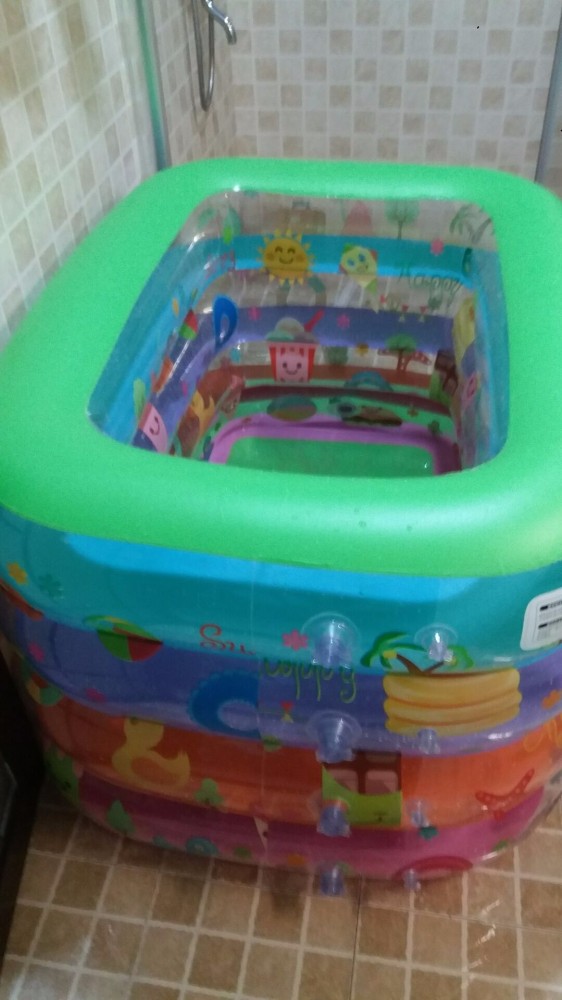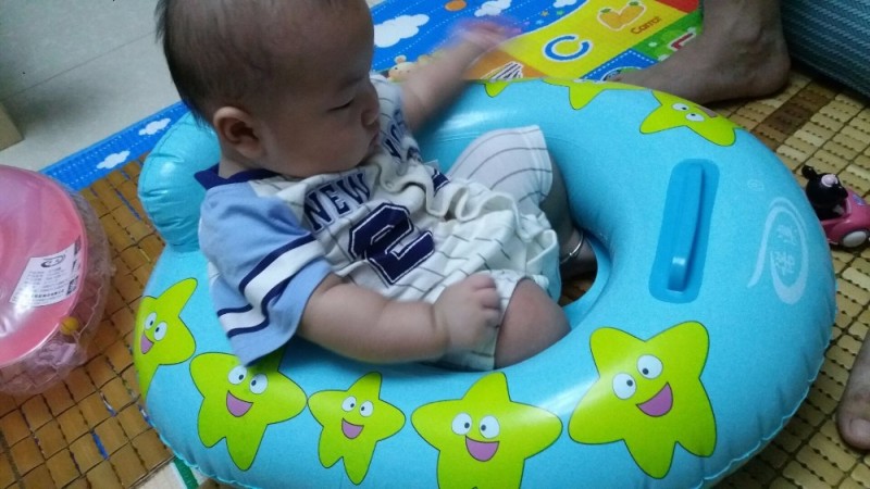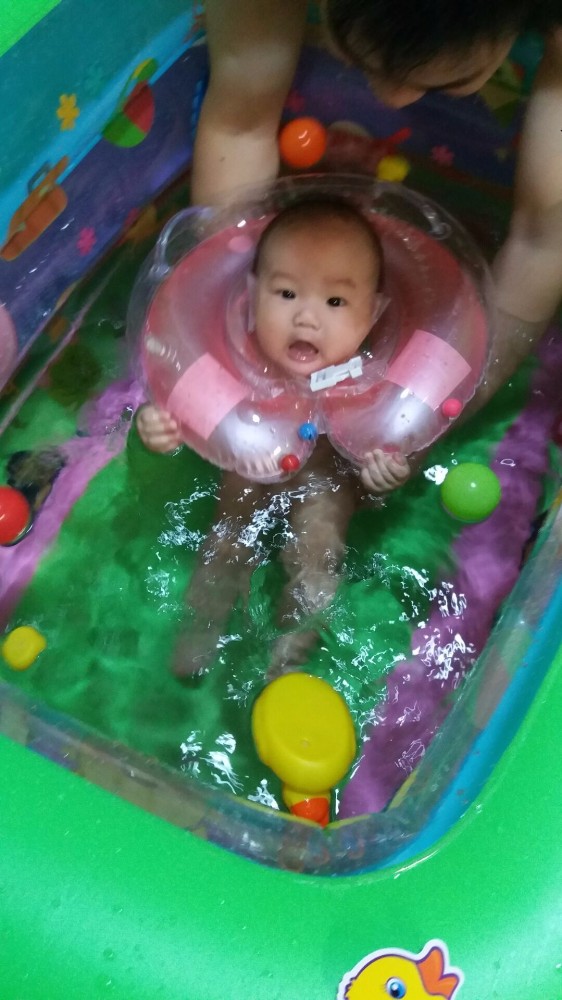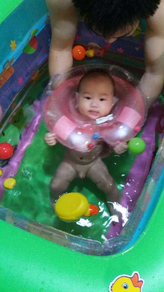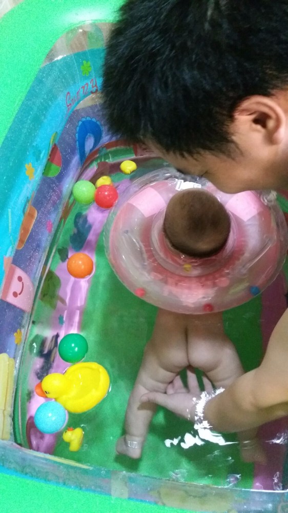 买回来后老公就先充气晾会散散气,再怎么说也是塑料的,一放就是一两周,期间一直没时间玩,今天一早就跑去综合市场买很多菜,没想到中途下雨没带伞,折腾几个小时才回到家,中午又有客人来家里包饺子,实在太累,下午跟宝宝一起睡了几小时。吃了点晚餐后跟老公说给宝宝开游吧,虽然买的不是很大,但也很占位置,我们要考虑能排水能放热水的地方,只有厕所或小阳台可以做到,最后决定在厕所游,说完老公开始充气放水,真心费水,放水就放了快半小时,准备工作就绪后,把小王子套上脖圈就放下水,我们都在旁边守着。