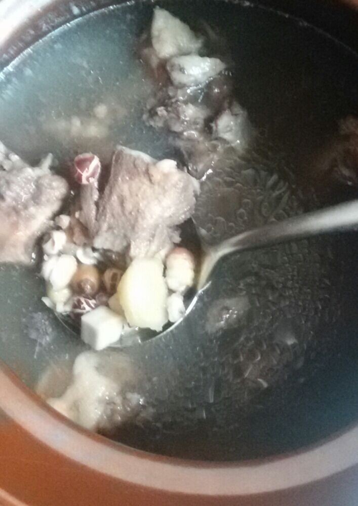 最近的小不点不太开胃,吃什么都吃得不多,每顿饭都吃一点点菜,然后只吃半小碗饭而已。从他几天的便便形状来看,发现他湿气比较重,所以我就琢磨着煲一个健脾祛湿的汤了。 可是煲什么汤好呢?家里的赤小豆已经没有了,单纯用薏米来煲骨头汤的话祛湿的效果不显,于是我就想到了健脾祛湿且平和的芡实和云苓,然后我就把它们都找出来,找出来的时候发现它们的袋子里还有一点黄芪和莲子,然后我就想把它们都放在一起来煲汤了,这样的话健脾祛湿的效果就更明显了,而且还有补中益气和清心火的作用呢。 因为我之前从来没煲过这个汤,所以我就想用平和的猪筒骨来煲了。虽然我没放多少的猪筒骨,但煲出来的汤看上去竟然有很多的油,幸好汤热的时候喝并不觉得很油腻的感觉,否则我这汤就白煲了。而小不点是个爱喝汤的主儿,只要有汤喝,他都喜欢喝。
