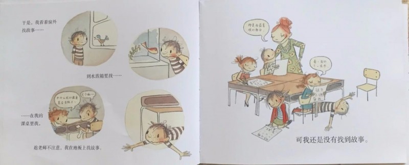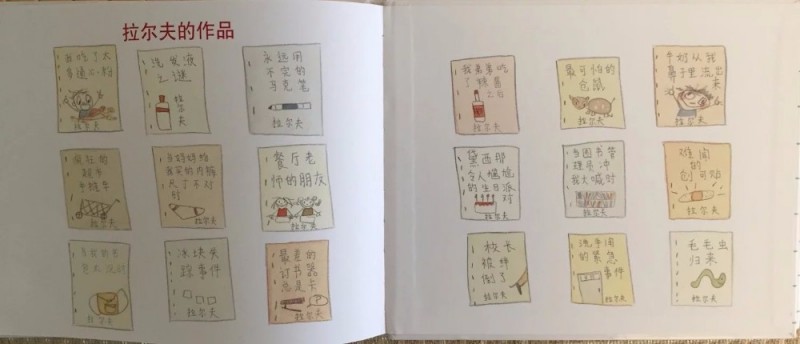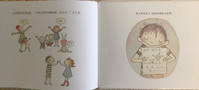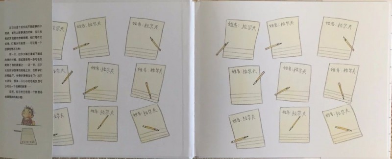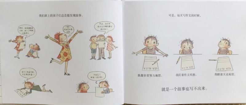 ——读《拉尔夫会讲故事啦》 爱听故事是孩子们的天性,说到讲故事,我敢打赌,对于大多数的孩子来说,都是件非常难的事情。我家就刚好有一个。所以在看到《拉尔夫会讲故事啦》这本书时,我也充满了好奇和期待。拉尔夫是如何做到的呢?封面上这个手拿文稿一脸兴奋和激动的表情的小男孩,不用说就是拉尔夫了。而他面前是一群或陶醉或期待的小伙伴们,看来拉尔夫的故事很吸引人啊!让我们也一起走进绘本去认识一下这位讲故事高手吧!![]() 打开书,真是让人傻眼了!只见环衬页满满的都是拉尔夫只写了姓名的空白作文纸。 ![]() 这是怎么回事呢?原来,拉尔夫也跟现实生活中的很多小孩子们一样,他其实最不会讲故事了。他是最害怕上作文课的。每到上作文课的时候,拉尔夫就如坐针毡,除了他自己的名字外,他一个字也写不出来。他听不懂老师为什么总是说到处都是故事。他也不明白为什么别的小朋友们都能写出有趣的故事来。这种来自环境的压力让他很压抑,拉尔夫感觉非常糟糕。他开始尝试做别的事情来排解这种写作文的压力,他想要逃避作文课无助又压抑的氛围。他甚至向老师请求去餐厅干活儿,让老师和同学都哭笑不得。 ![]() 跟拉尔夫形成鲜明对比的是他的同桌黛西,黛西都写了很多关于拉尔夫的故事了,还把它们都装订了起来,厚厚的,都成一本书了!在黛西的提醒下,拉尔夫开始到处找‘故事’。书中描绘拉尔夫到处找故事的情节充满童趣又夸张搞笑。我想我家宝贝也会像拉尔夫这样真的到处找‘故事’,因为他们觉得‘故事’是个非常抽象非常深奥的东西,太难了!费尽力气找故事的拉尔夫最终还是没有找到‘故事’,哦,可怜的拉尔夫! ![]() 躺在课桌下面,让拉尔夫找到了一些灵感,他想到了躺在公园草地上的情形。在老师的提示下,拉尔夫想到了公园里遇到毛毛虫的事情。但是当他真正坐下来写毛毛虫的故事时,又卡壳了,还是写不出故事来。但是,很快老师就叫同学们一起分享故事了,除了拉尔夫外,其他的小朋友们都积极举手要求主动分享。但是老师指名第一个由拉尔夫来分享。 拉尔夫鼓起很大的勇气才走到台前,他把几乎空白的作文纸紧紧捂在胸口,开始信口说起他在公园里遇到毛毛虫的故事。拉尔夫紧张极了,小朋友们一个个稀奇古怪的问题和期待的眼神给了拉尔夫巨大的鼓舞,他将在公园里遇到的那条毛毛虫后发生的有趣的事情娓娓道来。哈哈,原来是一个小宝宝把拉尔夫的毛毛虫装进了纸尿裤里,而拉尔夫和小宝宝都跟着毛毛虫学爬着走路呢,真是有趣的故事啊!大家都为拉尔夫的精彩故事欢呼鼓掌。拉尔夫也不再害羞,把自己只写了名字和开头,简笔画了一条毛毛虫和自己的作文稿大方地展示给大家。 ![]() 从那儿以后拉尔夫就成了讲故事高手了,他现在能随时随地发现故事,写的故事订了一本又一本。拉尔夫还有自己的写作小技巧呢,真是神奇的变化啊!绘本前后环衬页真是巨大的对比啊!之前是一张又一张的白卷,现在是一本又一本装订成册的故事集。来看看拉尔夫的故事吧!内容真是丰富啊! ![]() 拉尔夫把发生在自己身上的事情、发生在周围人身上的事情还有他看到的事情都写成了一个个有趣的故事,真是太棒了!用一句话概括可以说是:故事无处不在,关键是要有一双善于发现的眼睛,和及时记录的好习惯! 之前的拉尔夫让人看着着急,不会是太笨了吧?哈哈,当然没有笨孩子。重要的是他有一个好老师和一群友好善良的朋友们。是他们帮助拉尔夫找到了灵感和叙述的出口,也让拉尔夫找到了自信,最终造就了故事高手拉尔夫! 只要引导得当,让孩子留心观察生活,养成随手记录的好习惯,每个孩子都能成为讲故事高手! 其实,初学写作文跟讲信口讲故事一样,都不需要太多的技巧。只要写出真情实感,把你想要讲的故事来龙去脉表达清楚就可以了。看了《拉尔夫会讲故事啦》,相信很多小朋友都不再惧怕写作文了。你也许会开心地一笑:原来写作文很简单嘛,根本没有想象的那么难。
