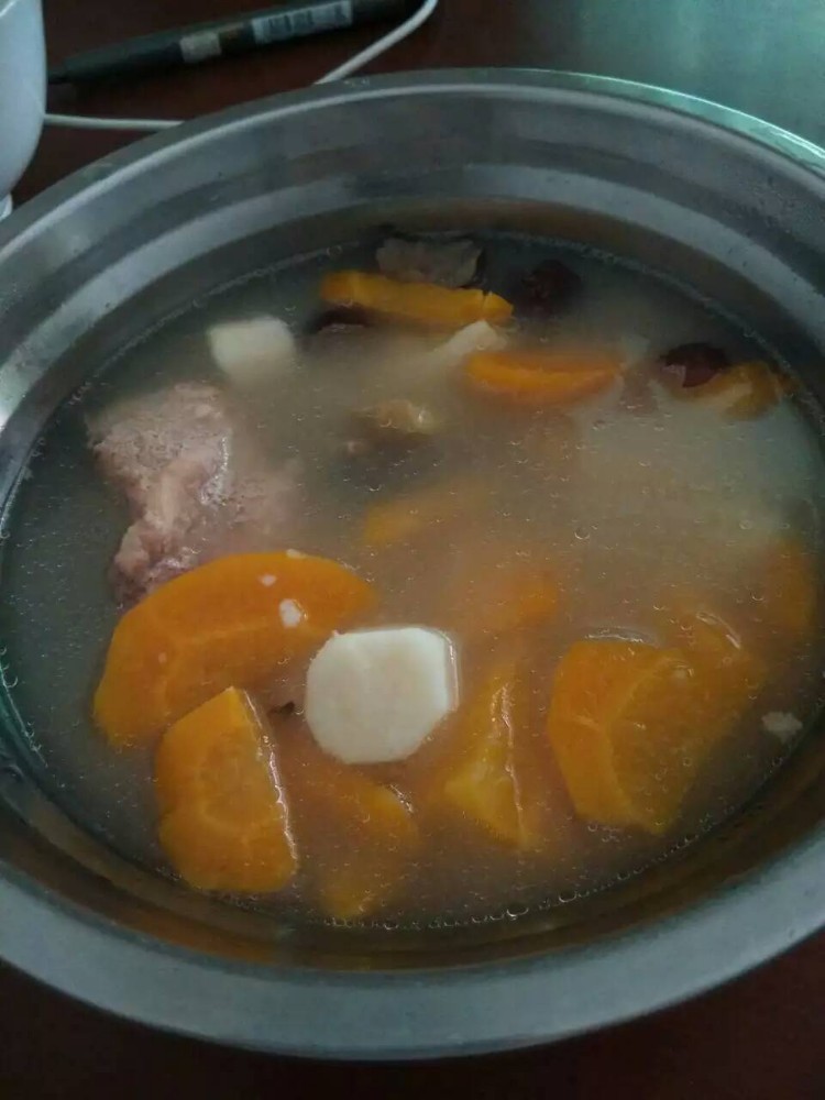 胡萝卜淮山猪骨汤 因为小不点的小姨感冒了,加上她非常的喜欢喝汤,而且她说会起得比较晚,所以我早上起来后就煲了胡萝卜淮山猪骨汤,想等她起床后当早餐吃。与其说是给小不点的小姨当早餐,还不如说是我自己也想喝这汤当早餐。考虑到上次我选了猪筒骨来煲汤有点油腻,所以我这次就算了尾龙骨来煲,这样煲出来的汤刚刚好,而且很清甜,大人小孩子都喜欢喝。下面跟大家说一下胡萝卜淮山猪骨汤的做法。 ![]() 材料准备: 胡萝卜一根(约250克)铁棍淮山250克、尾龙骨400克、生姜三片、红枣7枚 步骤: 1、 胡萝卜洗净,削去皮,切成刀滚状,备用; 2、 铁棍淮山洗净,削去皮,一半切块,一半拍碎,备用; 3、 生姜片洗净,备用;红枣洗净,去核,切片,备用; 4、尾龙骨洗净,然后放入锅内烧开的开水中焯一下,焯至变色后即可捞出,备用; 5、砂锅洗净,然后把上述所有的材料一同入入锅内,一次性加足水,然后大火煲,水煮开后改小火继续煲一个半小时; 6、关火调入食盐后即可饮用。