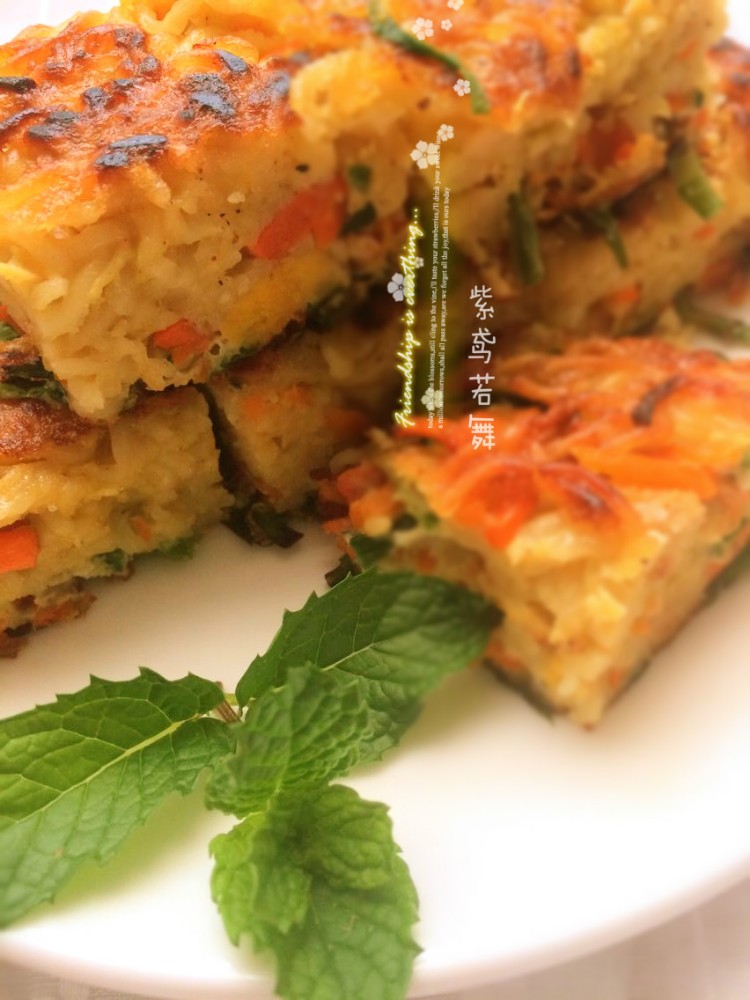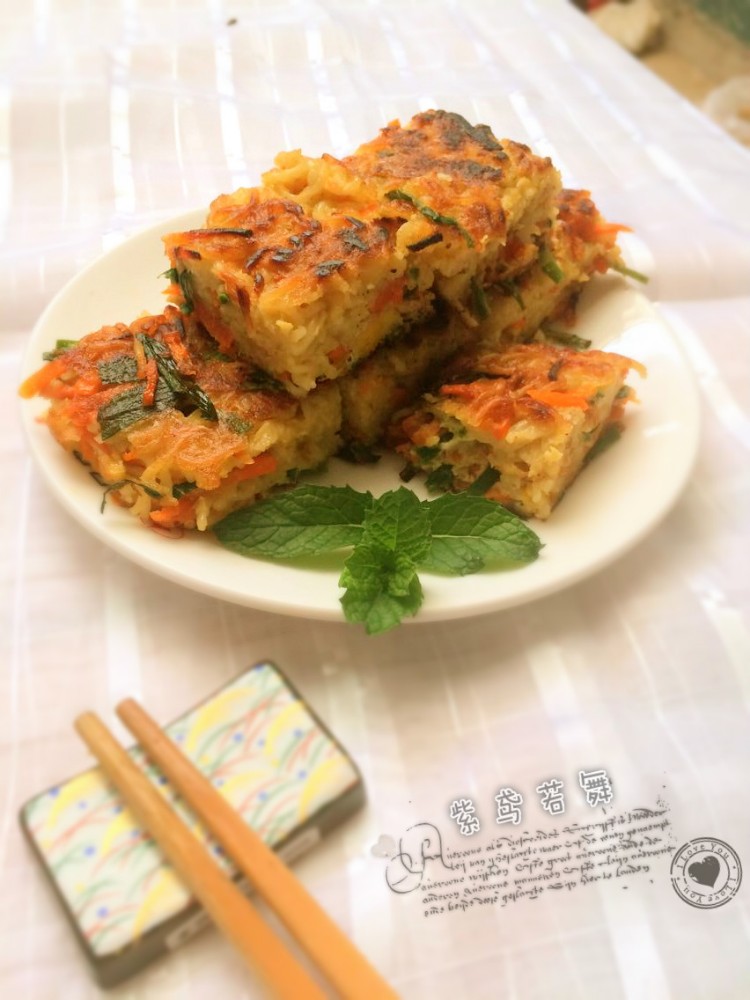 ![]() ![]() 所需食材:方便面,鸡蛋,胡萝卜,韭菜 制作过程: 韭菜洗净切段,胡萝卜切丝。 平底锅中放一点油,油热以后放入胡萝卜煸炒至八分熟。 方便面放锅内,加热水泡开(只要将面条泡散了就可以,别泡的时间太长) ![]() 鸡蛋磕入碗中,完全打散成蛋液,放入已经变温的胡萝卜丝。 再加入泡散的方便面和韭菜。 然后加入方便面的调味料,搅拌均匀。 平底锅中放一勺油,油微微热后把方便面先铺到锅中,将剩余的蛋液和蔬菜均匀撒在最上面。 ![]() 用中火煎至鸡蛋稍微凝固一些后,反转过来煎另一面,煎至颜色金黄。 两面煎好后,就可以出锅啦! ![]() 这种鸡蛋煎方便面其实做起来相当的简单, 做好以后也很好吃,里面鸡蛋的部分是又软又香,而外面煎脆了的方便面是脆脆的,吃到嘴里喷香喷香的感觉,喜欢吃方便面的可以试一下哦。 本作品未经作者许可不得转载,转载请征求作者意见。擅自转载使用,将保留追究其法律责任的权利! 评分记录