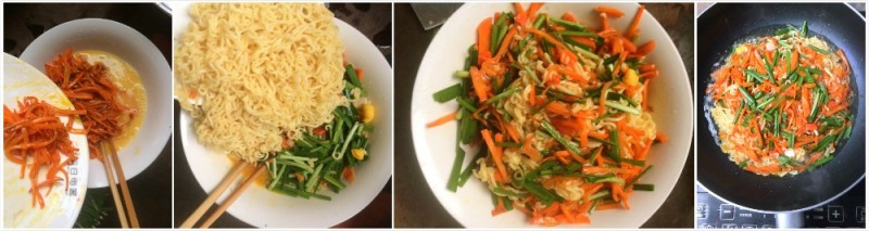 老公喜欢吃方便面。前几天去超市看到他喜欢的鲜虾鱼板面做活动,搬回家了一整箱。昨天是星期天,闲来无事琢磨怎么消灭方便面。家里有很多鸡蛋,就把鸡蛋加上蔬菜和方便面煎了一下,老公居然很喜欢,瑶宝贝也很喜欢吃。