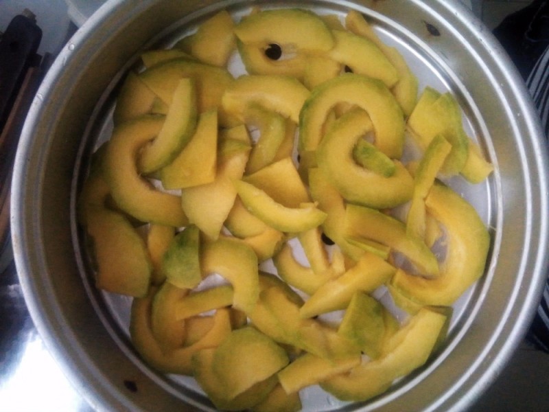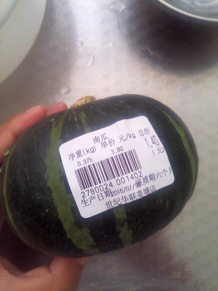 后来看看这种南瓜,也不知道能不能做的起来,但想着这南瓜小,就算做不好也没有什么,不会太浪费,也就挑了一个,称了一下,也就花了1.4元,回来后就放在一边,昨天早上打算做的,就让我妈把南瓜皮削了,然后我妈也切成了片状,看着这样的南瓜真的不咋样,我表示担心能不能做的起来,但既然已经弄了,还是要试试的啊。