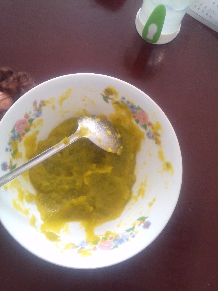 我就把电饭煲里面倒进开水,然后把切好的南瓜片放进蒸笼里面,放在电饭煲上面,弄好后就没有管了,去陪着孩子玩了,也没有注意看时间,反正玩了一段时间后,我妈去看了下,说是很软了,应该可以弄了,我又去看下,就把蒸笼拿了出来,把里面的蒸熟的南瓜倒进了碗里,拿勺子按成泥状,儿子看到了,表示很好奇,他也要弄,就让给孩子自己玩了一会。