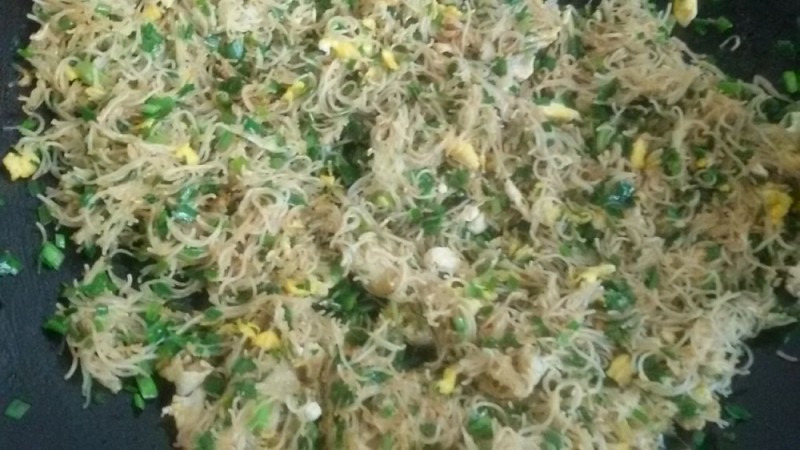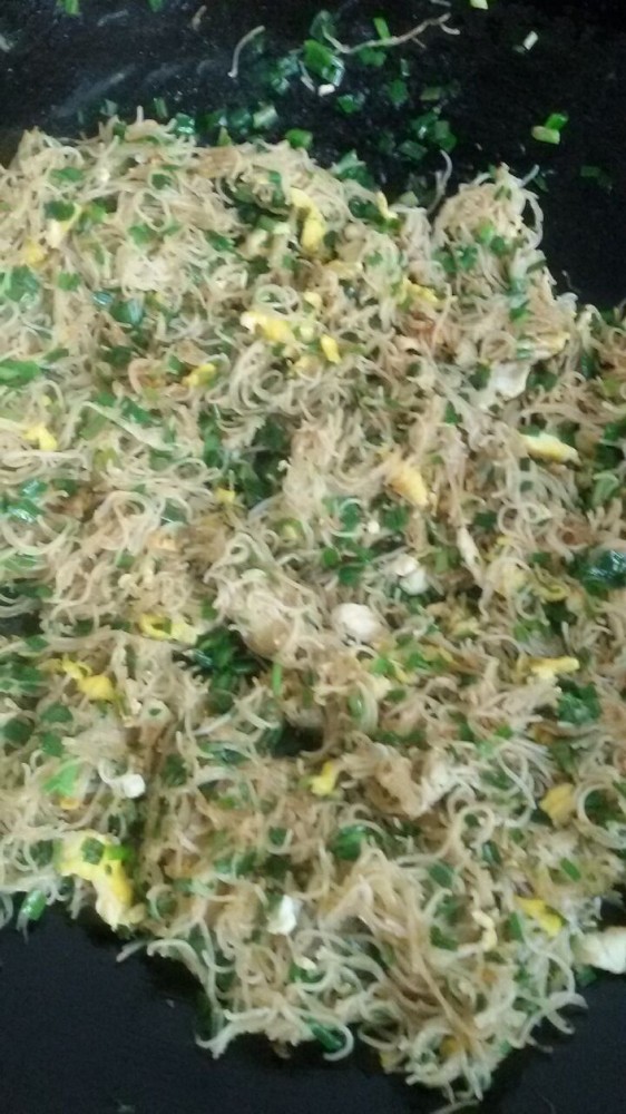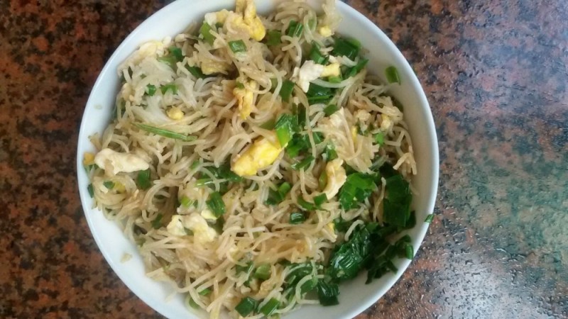 韭菜鸡蛋炒粉丝 一直以来,我都不太喜欢吃面食,就算吃也不会像平时吃粥饭那么多,除非是煮得特别好吃的面食我才会多吃一些。比如说今天早上宝爸做的韭菜鸡蛋炒粉丝,可美味了,未吃之前我就在房间里闻到一股香喷喷的韭菜鸡蛋味了(当时宝爸正在厨房里炒粉丝),所以吃的时候我吃了满满一碗还想再吃,后来竟然吃了一碗半,吃到锅里已经没有炒粉丝了,然后我才罢休。 附做法: 1、 先用清水浸泡粉丝十五分钟,然后捞出备用; 2、 两只鸡蛋的鸡蛋液煎成鸡蛋饼,备用; 3、 韭菜洗净,切小段,备用; 4、 锅洗净,烧热,加入适量的花生油,然后将粉丝放入翻炒,炒至粉丝水分干后再加入煎好的鸡蛋和韭菜段一起翻炒,然后调味关火,盛出食用。