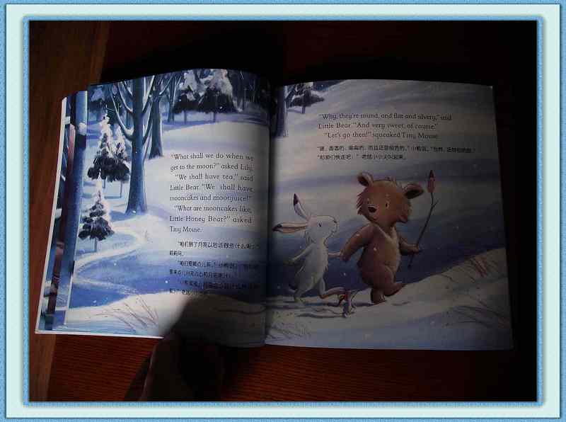 作 者:思铭 译 (英)罗贝文 编 (英)华恩斯 出 版 社:中国电力出版社 出版时间:2008-03-01 页 数:24 装 帧:平装 开 本:大16开 内容简介:小熊蜜蜜睡不着。月亮挂在他和窗外闪闪发光,像白天一样明亮。而且,没错,她在朝他微笑!小熊蜜蜜和他的两个伙伴,长耳朵莉莉和老鼠小小,发现了一条银色的月亮小路。于是他们沿着小路出发了,他们要和月亮一起喝茶。可是,小路越来越陡峭,风越来越冷,而且,忽然之间一片漆黑。月亮到底藏到哪里去了呢?一个关于友谊和快乐的小故事,从头到尾到充满着奇妙和精彩! 看看图书的封面,蓝蓝的背景天空下,一轮皎洁的月亮挂在天上,月光下是小熊小兔子,还有小熊肩上的小老鼠,这究竟是怎样的一个故事呢,已经忍不住要翻开书本好好的看一看。 这本图画书属于:呵呵这个是刚借回来的书,所以不能签上乐乐的名字哦。 呦,你好啊月亮!小熊蜜蜜对着月亮大声的打着招呼,这么迷人的月光从窗子照进来,小熊蜜蜜觉得月亮正对着他笑呢!小熊蜜蜜再也无法入睡了,于是他冲出家门跑到闪亮的林子中去了。也许我看到这么迷人的月光也会这样做吧!这不仅是孩子才能享有的快乐! 小熊蜜蜜来到林子里,他看到长耳朵小兔莉莉正在堆雪人,原来她也是被这迷人的月光吸引。小熊蜜蜜说月亮对着他笑呢,小兔子莉莉也说月亮对着他笑,原来月亮对着大地微笑着。于是两个小伙伴在森林里你追我赶,玩了起来。深夜小孩子单独出去玩,恐怕我们不会让自己的宝贝这么做吧。 翻开这一页,味美的画面有一次吸引眼球。小熊蜜蜜和小兔子莉莉相视而立,一条弯弯曲曲的小路一直延伸,延伸,似乎正好可以到达月亮上面,就在他们的旁边,我发现了一只可爱的小老鼠,这个画面也引出了故事情节:“这是去月亮的小路!”小熊大喊,还提议一起走路走到月亮上去。这个时候一个小小的声音尖叫着:“小熊蜜蜜,我能一起去吗?”这是老鼠小小的声音,于是三个好伙伴一起沿着月亮小路出发了。 他们一边走一边聊天,聊着到了月亮以后要做的事情,小熊蜜蜜拉着小兔莉莉的手,多么开心快乐的旅程啊! 可是美好并没有持续,因为黑夜忽然间变得寒冷了,看看老鼠小小冻得可怜的表情,于是小熊让小小来到自己的肩上,把小脚趾藏进小熊厚厚的绒毛里,就暖和多了,他们继续走路。三个小伙伴之间的互相帮助与关心,又一次打动这我们每一位读者,温暖着每个人的心。 可是小路延伸到了山顶,路上变得更加的寒冷,一片好大的黑云飘到了月亮前面…… 于是突然间一片漆黑,月亮小路也不见了,看看三个小伙伴依偎在一起,她们开始害怕了,并且都说不想去月亮上了。这一页的天空出现了黑黑的乌云,只有雪片是白色的亮点,真是感觉好寒冷。 没有了路,他们从小山坡上跌跌撞撞,一步一滑的走下来,直到他们回到了树林。小熊蜜蜜说:“可能月亮生气了,她应该不想见到我们吧”当月亮躲进云层的时候,小熊这样猜测了,这就是孩子的想法吧。老鼠小小和小兔子莉莉都说想要回家。是啊,在经历了这样的黑暗之后,有谁不想回家呢? 可是太黑了,没有了月亮的光,树林里面漆黑的一片,他们找不到回家的路,可怜的三个小伙伴,在这个黑夜的小树林里迷路了,打出都是黑影,小熊蜜蜜也开始害怕:我要妈妈!他们要怎么办呢? 就在一刹那间,一束银光倾泻下来,照亮了树林,原来月亮终于出来了。接着在高高的天上,在树丛中间,笑眯眯的月亮出现了!这真是令人欣喜的事情。大家都高声的呼喊着:“万岁!”而这个时候,月光照在了大大的、毛茸茸的大熊身上,她张开双臂向他们跑来。原来大熊妈妈终于找到了小熊蜜蜜,并且给了他们一个紧紧的拥抱。搂着大熊脖子的小熊笑眯眯,小兔子也开心的跳了起来,老鼠小小则爬上了大熊的手掌! 大熊妈妈把他们带回了家,面对几个调皮的小孩子,大熊妈妈给他们准备了很多的好吃的还有热乎乎的牛奶,并且告诉他们:“月亮并没有生你们的气,他一直都在那里,只不过,乌云把她给遮住了!”小伙伴们这下就明白了,一起美美的想用大熊妈妈准备的晚餐了。 小熊该睡觉了,在床上,小熊还告诉妈妈:“妈妈,我特别特别想去月亮上,想见见她。”大熊妈妈温柔的对小熊说:“是吗,我的小熊,我们并不需要到月亮那里才能看见她——她就在我们的身边!”这个时候,透过窗户,看到月亮正微笑着看着小熊。“晚安,月亮!” 这本书是电力出版社的倾心力作,英汉双语,无论是画面还是文字都非常的迷人,非常好的睡前故事读本,还是一本可以点读的有声图画书哦!乐乐看到之后就非常的喜欢,主要是我们没有点读笔,也没有办法读英文的部分,要是乐乐再大一些就可以看懂英文的部分了,这对于孩子英语阅读也是一个促进作用,这本书不仅适合小孩子看,对于小学生也是可以看的哦,所以说这本书的阅读的跨度就非常的大,具有非常好的信价比,很好的收藏价值哦,不过这本书不是属于乐乐的,而我我借来给乐乐看的一本书,乐乐这么喜欢,下个月的购书计划一定要把这本书加入其中! 本作品未经作者许可不得转载,转载请征求作者意见。擅自转载使用,将保留追究其法律责任的权利! 评分记录