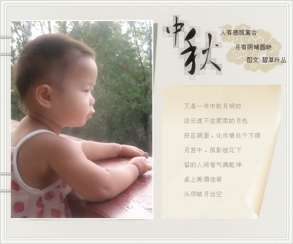 上午老公和宝宝睡到八点多才醒,然后吃过早饭,收拾完了,看天气很好,就跟老公说,要他带着我跟孩子去公园玩。老公很愿意跟我们一起,毕竟一家人在一起逛逛公园,那是件多幸福的事情。 扬扬坐在车上,特别的活跃,小嘴一个劲的说个不停。“爸爸开车带妞妞出去玩啦!”“妈妈抱着妞妞。”“我自己坐着吧。”“妞妞要过去找爸爸。”……哎呀呀, 这小人坐在后座上小嘴不停的说,一会儿看上爸爸的方向盘了,一会儿又拿出了车座里面的报纸了,不是翻这个,就是找那个,小小的车厢让她弄的热闹的很。 到公园了,停车下车去公园喽!刚一进公园,扬扬就挣脱着不让抱了,“妞妞自己走,妞妞自己走吧!”迈着小碎步,P颠P颠的就往前走过去了。在小广场上,坐跷跷板,玩单杠,和小朋友一起踢皮球,玩的不亦乐乎。在广场玩了一大会,又去湖边看,看到好多好多的小船在水里划,扬扬也想去划船。可是她太小,又好动,到船上怕不安全,还是在边上看河里的小船吧。河边还有个大铁狮子,那么大,扬扬看到有小哥哥坐在大狮子的脚上,扬扬也要去坐着去。呵呵,和爸爸两个人一起坐在上面玩吧,有爸爸陪着,扬扬玩的很开心呢。 在假山上的小凉亭里还玩了一大会,扬扬趴在凉亭的小坐椅上,弯着腿踢着着小脚,东看看西望望,小姿势摆的还挺舒服的。凉亭一共那么大个地方,从这边转到那边,从西边又走到东边,看看叔叔打扑克,看看小朋友玩游戏。转了一圈回来看到妈妈的包包,伸手就拿妈妈的包,“妞妞想吃东西了,妞妞想吃东西了。。”呵呵,这小馋妞,一会儿这小嘴也不愿闲着。 在公园转了一大圈出来,嫂子打电话说晚上去她家吃饭。虽然跟哥哥嫂子只是朋友关系,但是却感觉像家人一样,有什么事情他们都会想着我们。扬扬到了她家里,一进院子就直奔屋里去了,一点没有认生的感觉,相反处处对她来说充满了好奇。看到奶奶就喊奶奶,跟奶奶一起玩,一起看电视,好像很熟似的。嫂子还说,我抱扬扬的时候,老是吱吱的不让我抱。这跟她奶奶玩的真好,也让抱也让碰了。呵呵,话里还带着一点点醋意呢。 简单炒了几个菜,然后大家就坐在桌前开始吃饭了。扬扬这个也吃,那个也要,有她在永远都是那么热闹。吃饭的过程中,哥哥和老公免不了忆苦思甜一把,说说当初刚认识的时候,说说这几年来的变化,越说还越有劲。真是服了他们了,一喝点酒,就可喜欢把以前的事情拿出来说说,好像现在就没什么可说的一样。他们愿意说什么说什么,我跟嫂子和扬扬一起玩。看着这个小家伙,从一点一点长到现在这么大,时间过的还真是快。 今年阴天,从哥哥家出来的时候,也看不到圆圆的月亮。虽然说越长大对过节越来越没什么感觉,但是过节的时候,能够和家人和朋友在一起,也是一件特别幸福的事情。希望我们的小宝贝健康成长,她的快乐就是我们全家人的幸福。 ![]()