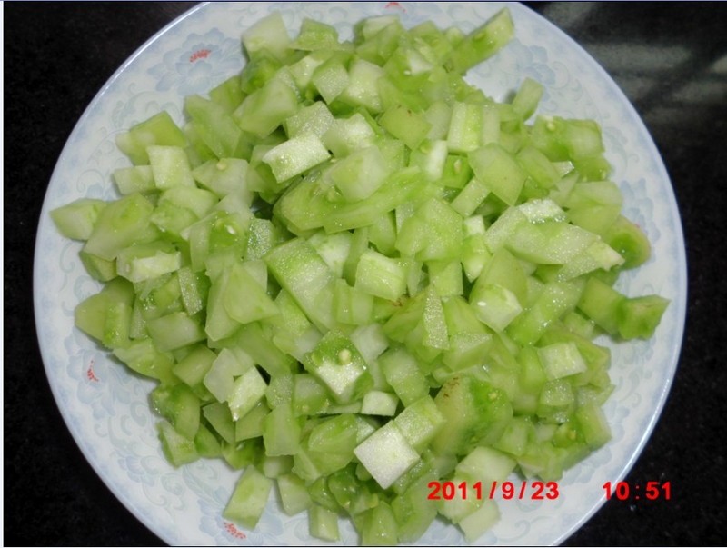 据其介绍,青西红柿含有生物碱甙(龙葵碱)其形状为针状结晶体,对碱性非常稳定,但 能够被酸水解。所以,未熟的青西红柿吃了常感到不适,轻则口腔感到苦涩,严重的时候 还会出现中毒现象。特别是当青西红柿开始腐烂时,其龙葵碱就会被破坏。而青西红柿变 红以后,就不含龙葵碱了。 可是,今天在市场上,我看到了好多的青番茄,因为以前也吃过!所以就忍不住买回来两个,配着青辣椒!(其实要是有红辣椒就更好看了)做了一个青椒炒青番茄的菜! ![]() 我想我这俩青番茄,都有点发白了,快要红了!应该不会含有生物碱吧! 第一步,把青番茄,写成小丁丁的形状! ![]() 呵呵,我的刀工不好,切得不均匀! ![]() 青辣椒也切成同样的大小!辣椒有点辣啊,手都发热了! ![]() 葱花是必备的哦! ![]() 先把油烧热,放入葱花爆香,再放入青番茄,炒的时候,心里老想着里面有生物碱,就多炒一会儿,不知道能不能把生物碱炒没了!心理作用吧!炒了大约一分钟,再倒入青辣椒翻炒!放上盐味精,花椒,我还放了酱油!安全起见,我多多在锅里炒了两分钟! ![]() 看看,很不错吧,满盘子的绿色,呵呵!拿来馒头一夹,呵呵,真香啊,辣椒里有青番茄的酸味,青番茄里渗着辣椒的微辣!又有香葱的清香!我忍不住多吃了一个馒头!现在感觉没有任何异常,呵呵!大家也来试试吧! 本作品未经作者许可不得转载,转载请征求作者意见。擅自转载使用,将保留追究其法律责任的权利!